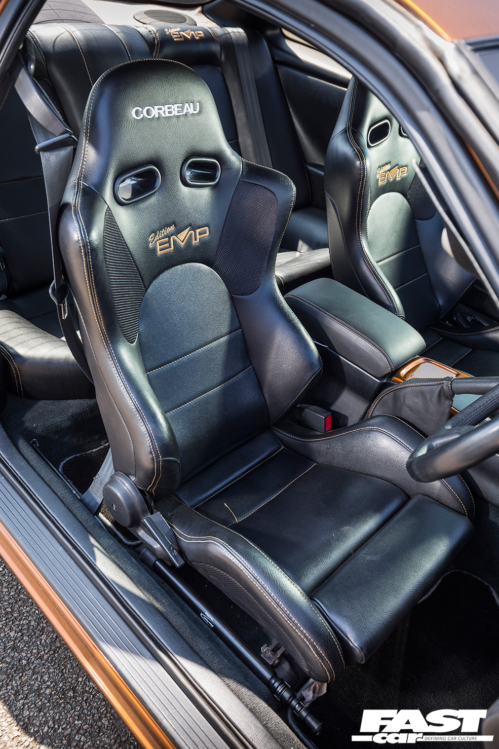 Corbeau RS2 reclining bucket seats retrimmed with bronze stitching; retrimmed rear bench; MOMO steering wheel with quick-release boss; bodycoloured trim panels; retrimmed and stitched gear gaiter, handbrake cover, armrest and door handles.