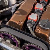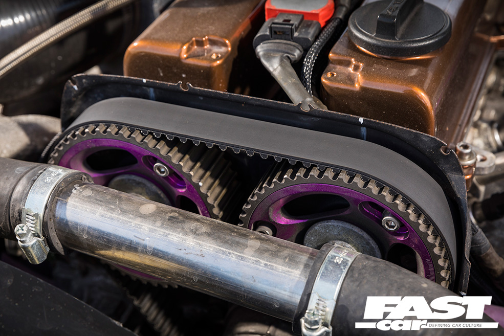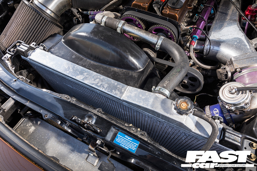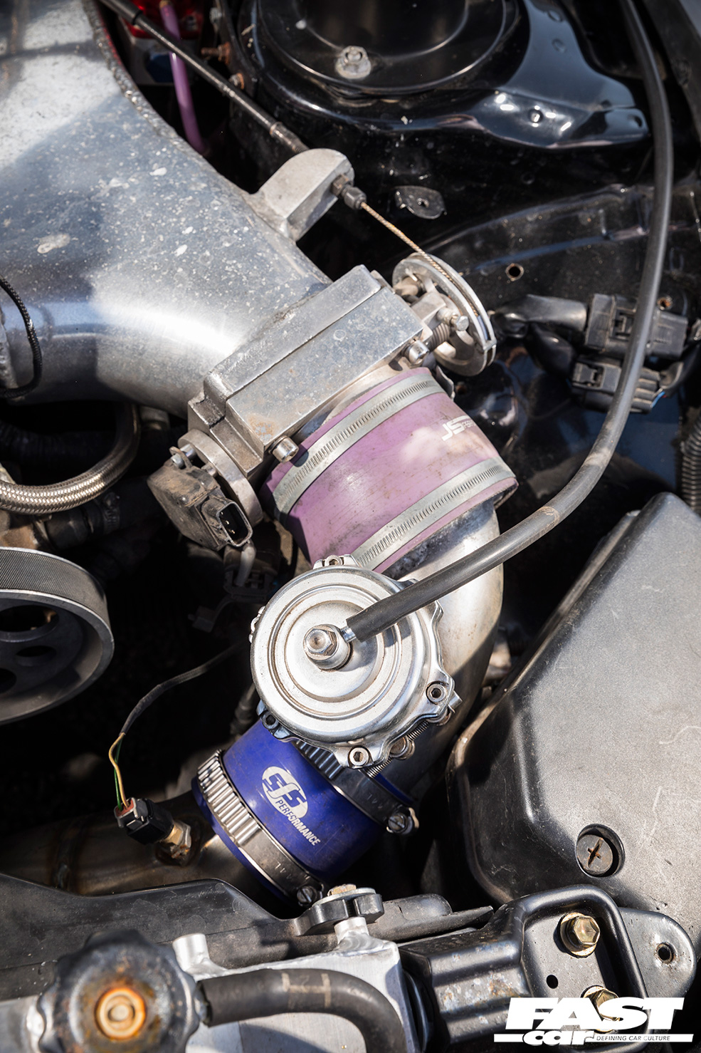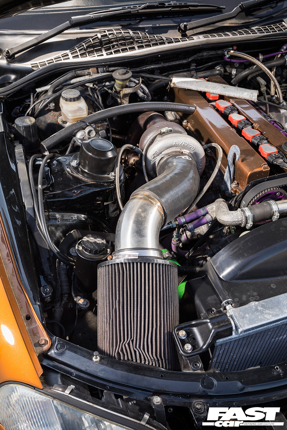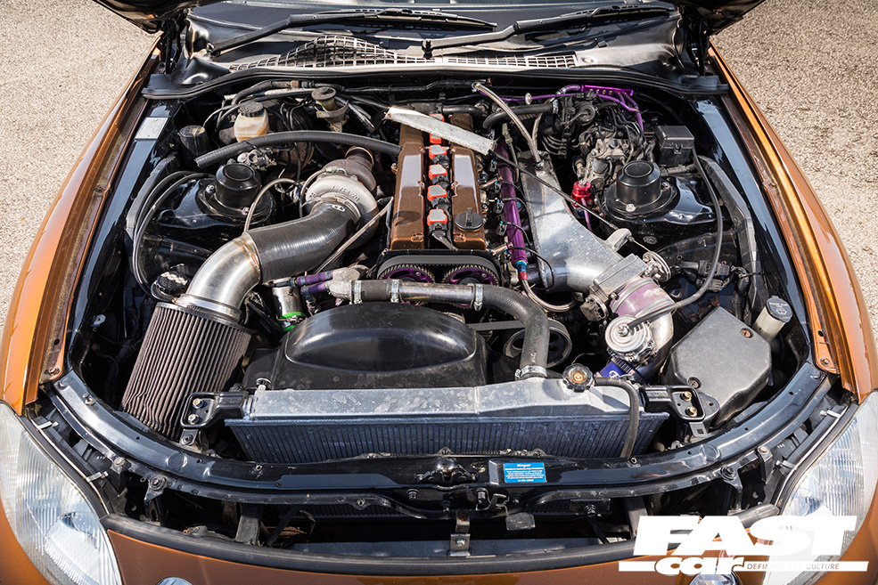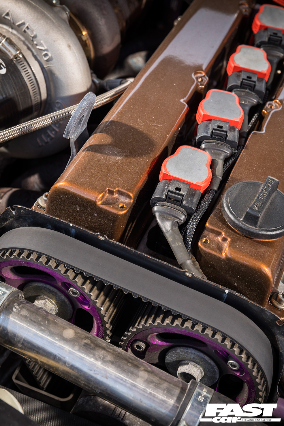 2.5-litre 1JZ-GTE straight-six engine; fully forged internals (comprising Brian Crower pistons, ARP head bolts and head gaskets); reworked cylinder head (comprising Brian Crower valves and springs, HKS 285 camshafts, HKS adjustable pulleys and ARP head gasket); Owen Developments 35/82 HTA 360-degree roller bearing turbocharger; custom Walton Fabrication’s 6-branch manifold; TiAL 50mm external wastegate and screamer pipe; GReddy 100mm-core front-mount intercooler; custom 4in air intake with K&N cone air filter; 100mm throttle body; custom inlet manifold; Bosch 740cc fuel injectors; Audi R8 coil packs; alloy radiator; custom EMP Performance mandrel-bent and TIG-welded exhaust system; Link G4+ Extreme standalone ECU with custom Nispro Performance map.