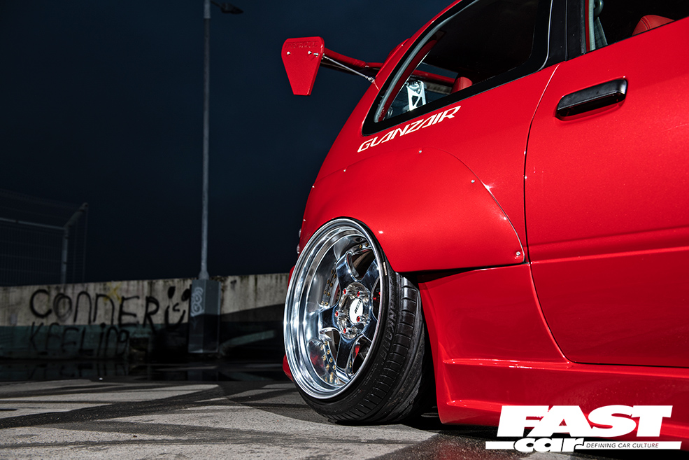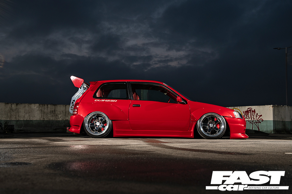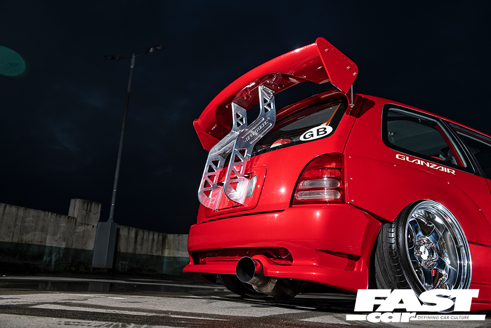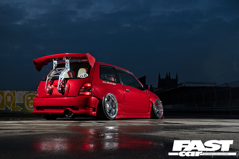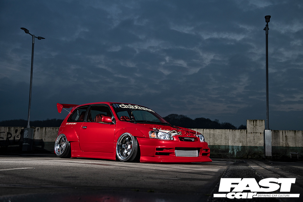 This is around the time things really ramped up a notch and the humble boosted hatchback began to take the unforgettable form it sports to this day. We caught up with Bradley as him and his pals were stuck underneath the Glanza in his garage, performing an engine-out re-spray on the entire car in this Dodge Redline red hue. Soon also sporting those perfectly-executed wide arches, a set of tasty split rims and, controversially, the adapted air suspension system that’s still thought to be the only one of its kind around, you probably won’t be too surprised to hear the Toyota created huge waves when unveiled in this guise a couple of years back.
