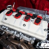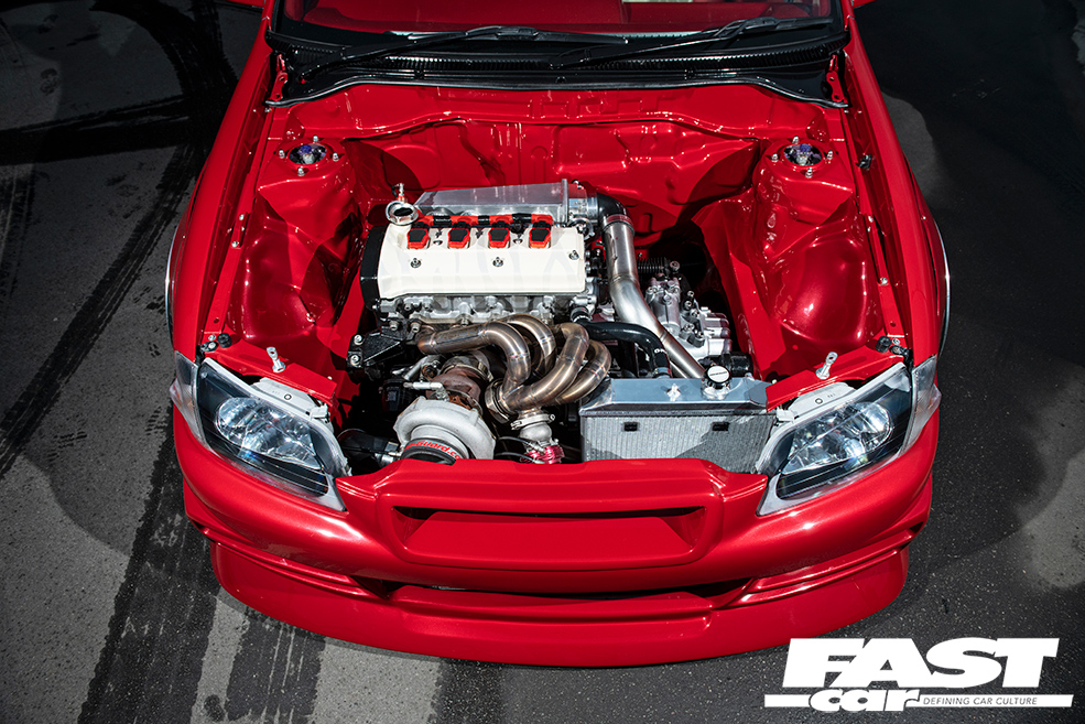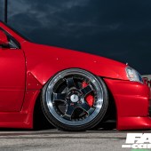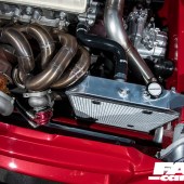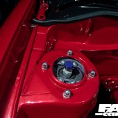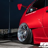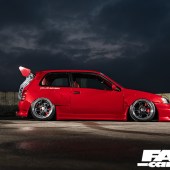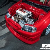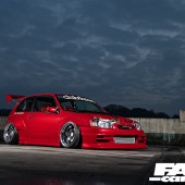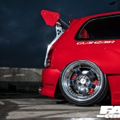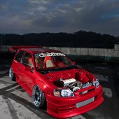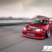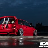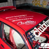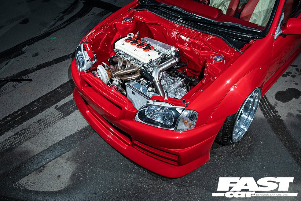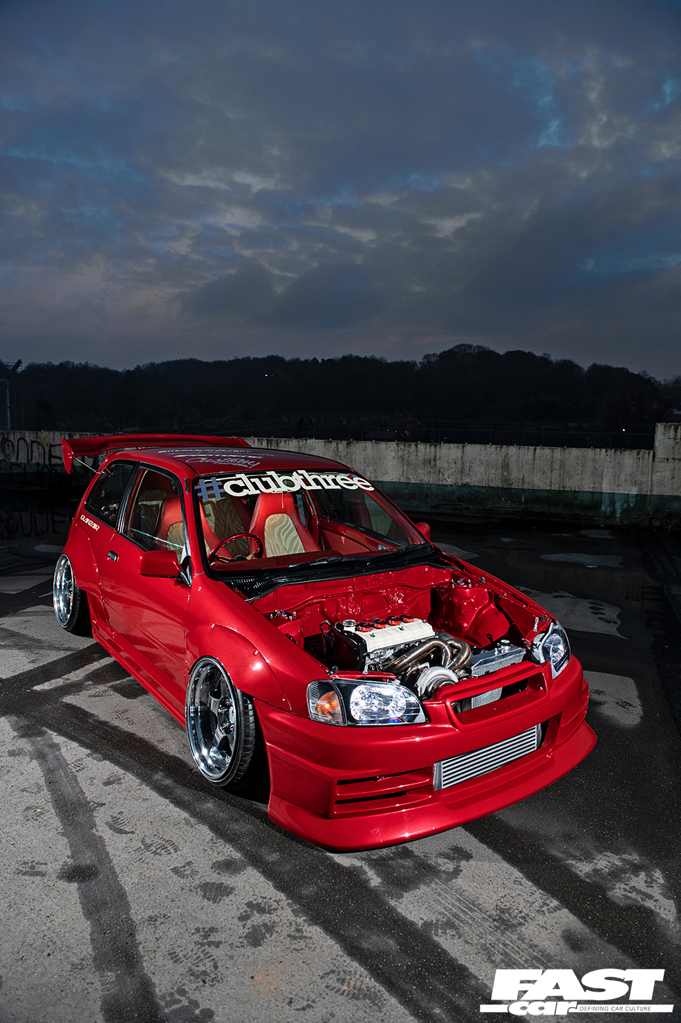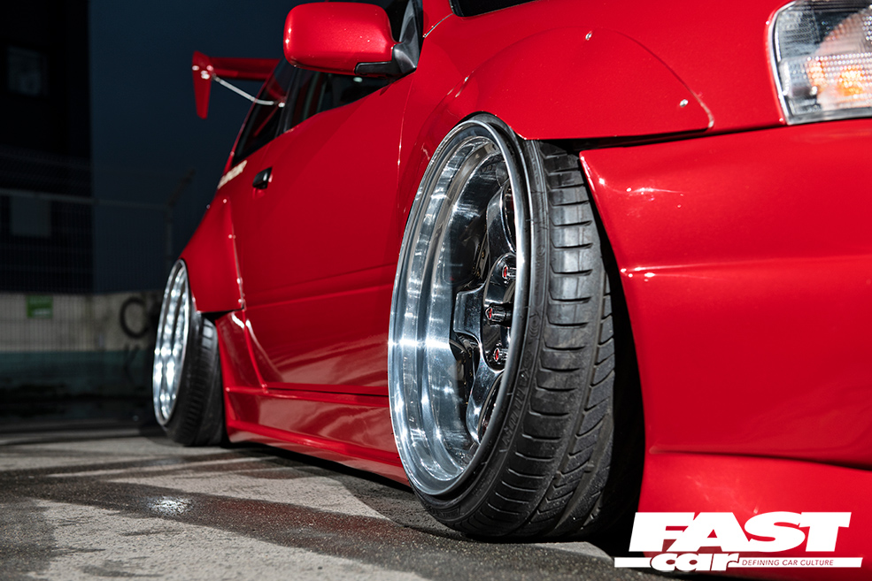 This is around the time things really ramped up a notch and the humble boosted hatchback began to take the unforgettable form it sports to this day. We caught up with Bradley as him and his pals were stuck underneath the Glanza in his garage, performing an engine-out re-spray on the entire car in this Dodge Redline red hue. Soon also sporting those perfectly-executed wide arches, a set of tasty split rims and, controversially, the adapted air suspension system that’s still thought to be the only one of its kind around, you probably won’t be too surprised to hear the Toyota created huge waves when unveiled in this guise a couple of years back.