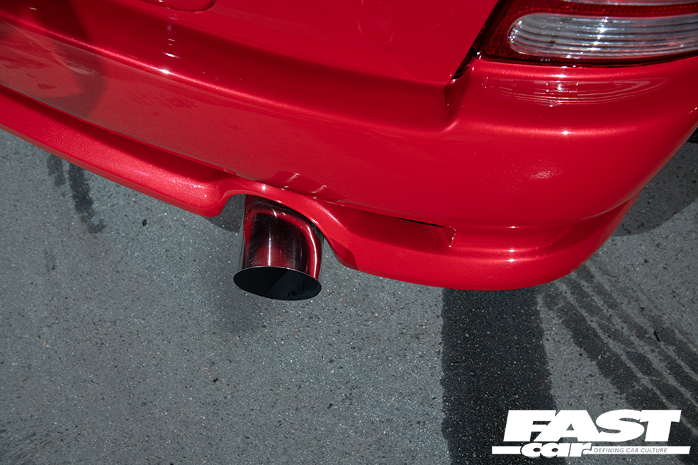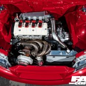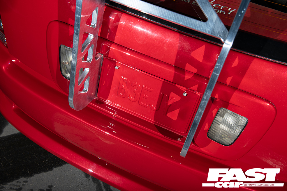 Full re-spray in Dodge Redline Pearl Red; CarbonMiata wide-arch body kit adapted to fit; Livesport front bumper and side skirts; Jam rear bumper; Proto-CNC custom billet alloy rear spoiler frame; Starlet Remix rear lights; washer jets and lock barrels removed; ID-Workz reverse bonnet scoop; welded and smoothed engine bay; ABS, air con, power steering, brake servo, master cylinders and original wiring loom all removed; wiper motor relocated to inside car behind dashboard.