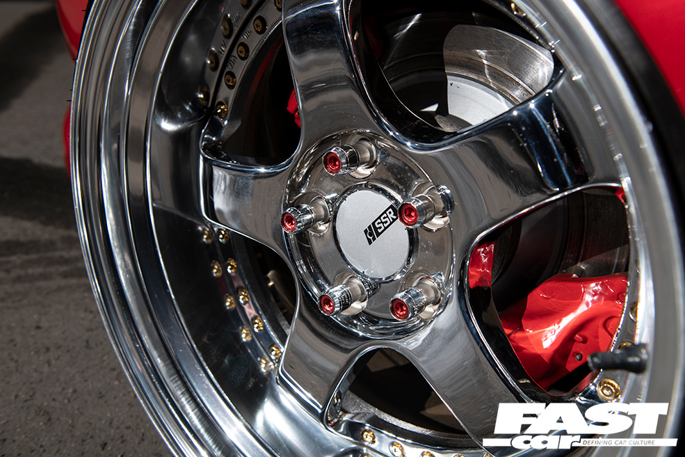 Another recent change comes in the form of rolling stock – with some seriously JDM SSR splits now taking pride of place under each of those capacious arches. Again, it was a job that didn’t come without its headaches though, involving 5×114.3 hub conversions all-round to allow for wider rims to be spec’d up without sacrificing clearance for that air suspension system. Finished up with chrome faces and polished dishes, when you see the epic appearance these five-spokers give off, we think you’ll agree it was all worth the effort!