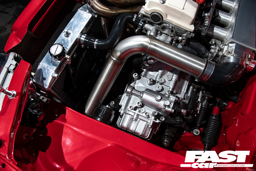 It was back to the drawing board that winter, then, with another engine-out overhaul which this time saw him taking the clean look under the bonnet to the extreme. “Bits like the ABS, power steering, air con and even the car’s wiring loom are all gone,” he grins, using clever tricks like routing cabling through the front wheel chassis leg and even relocating the wiper motor to behind the dashboard in the name of cleanliness. And it’s all resulted in a bay that seems to defy physics as far as a working car engine is concerned.
