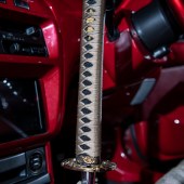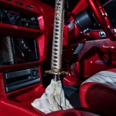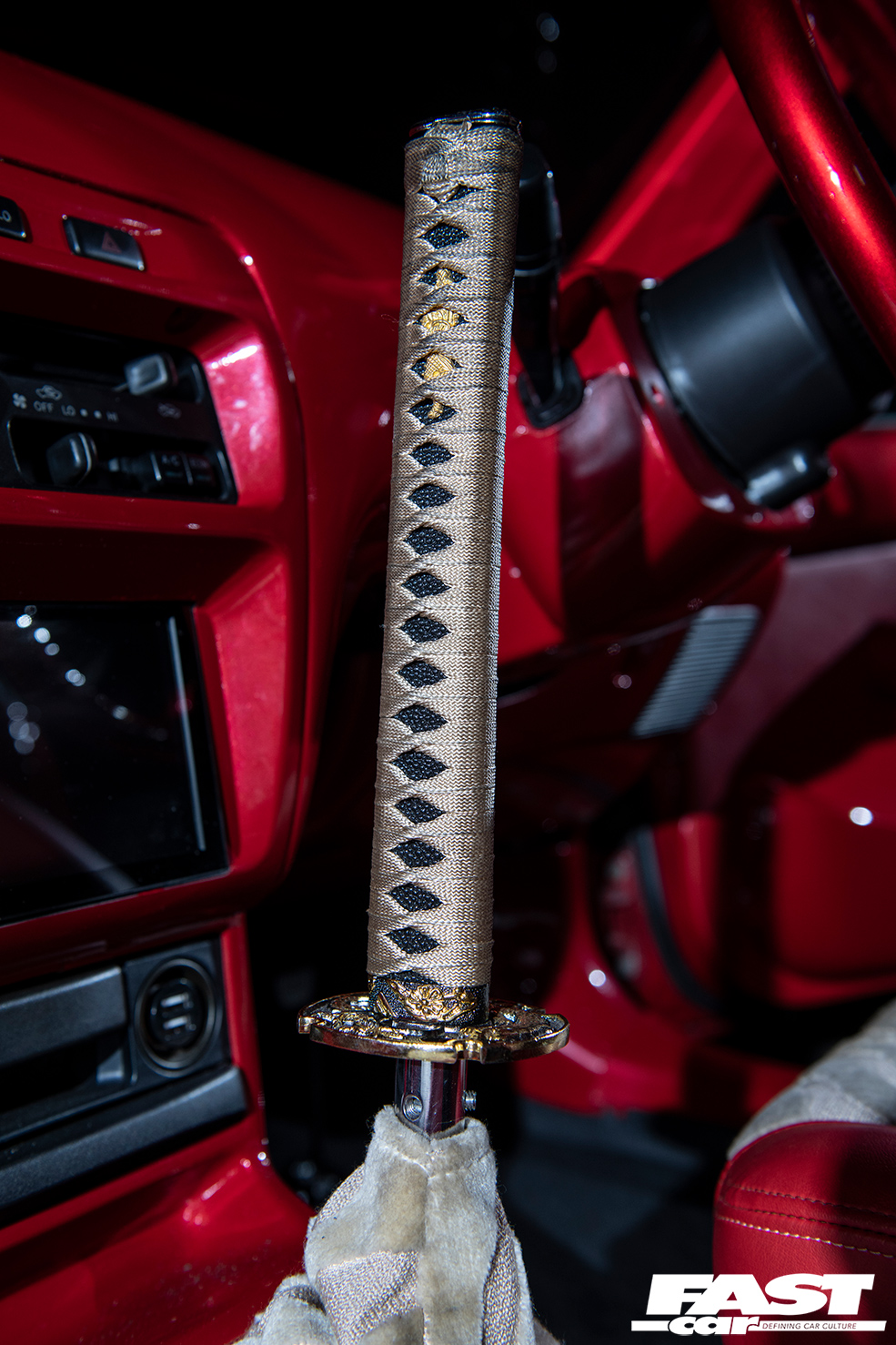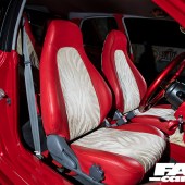 Smoothed/painted dashboard and interior trims; 4x Glanza V reclining bucket seats re-trimmed in red leatherette and gold/cream zebra-print centre panels; universal speedo cluster; samurai sword handle-style gearknob.