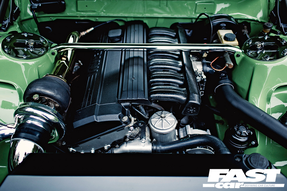 M50B25 engine from a 1995 BMW 525i, Holset HX40 turbocharger, custom split pulse exhaust manifold, 50mm wastegate, 3in stainless downpipe, intercooler, 45mm Simon Marmander blow-off valve, 550cc Lucas injectors, VAG COP ignition coils, Bosch 044 fuel pump, electric fan from Volvo V70, K&N air filter behind the grille, VEMS engine management system, ZF gearbox from a BMW 525i ’92, M20 flywheel, Sachs 618 clutch