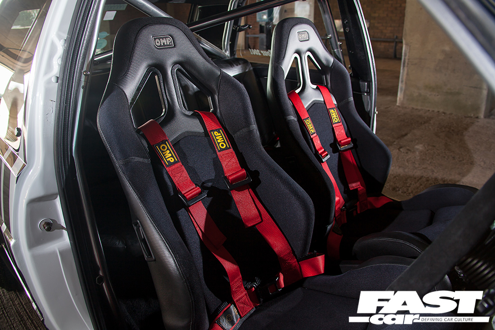 OMP seats and harnesses, OMP flat-bottom steering wheel, air-ride install in the boot, half cage, leather rear bench, US-spec heater control panel and various US switches