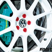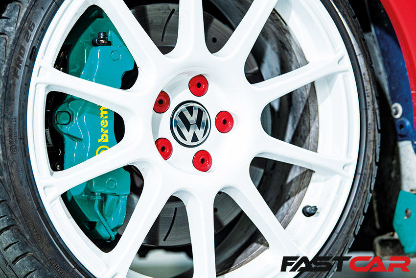 19” VW Motorsport wheels, 225/35/19 Pirelli P Zero tyres, BC Racing multi adjustable front shocks, Koni rear shocks, fully poly bushed, welded Tylah Motorsport roll cage, front Porsche Cayenne Brembo brakes, rear Golf R32 brakes