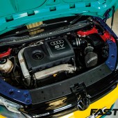 There were many other modifications needed before any bodywork could be bolted back up and that included the intercooler. Paul continues: “The Audi intercooler wouldn’t fit and so I upgraded to an Airtec version that, with some chopping about and plastic weld, sat perfectly behind the stock bumper. There was the option to have the pipework routed through the bumper like some do, but I wanted to keep it just a little bit stealth.” The installation of the intercooler took a week to complete with Paul and Bikki putting in the hours after both their workshops had shut for the day.