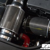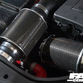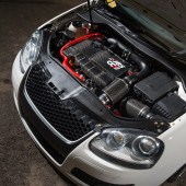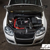Naturally there’s a bit more to squeezing over 400 ponies out of a TFSI than bolting on a sodding great snail and watching what happens. Stuart’s next move was to have a chat with Forge about mixing a few choice mods from their stellar catalogue, before basically just buying everything from them and carting it back to the garage in a massive wheelbarrow. We’re looking at the carbon fibre Forge Twintake system, dump valve, oil and water caps, Twintercooler, silicone coolant hoses, catch tank, all sorts, taking care of the belt-and-braces to keep this mental Golf ticking.