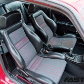 Recaro front seats retrimmed in OE Rallye material with black leather bolsters, Corrado seat frames, factory leather door cards, Digifiz cluster, VDO boost gauge in custom dash air vent pod, digital air/fuel gauge, MOMO steering wheel, Volkswagen Motorsport horn pad and gear knob, OE cassette player and first aid kit