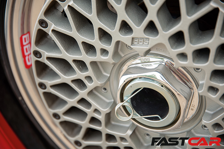 FK coilover suspension, 17×7.5 Porsche 935 BBS E48 wheels with zero-inch lips, custom centrelock adaptors (25mm front, 45mm rear), 185/35 Nankang NS-2 tyres, stainless steel brake lines, calipers painted red