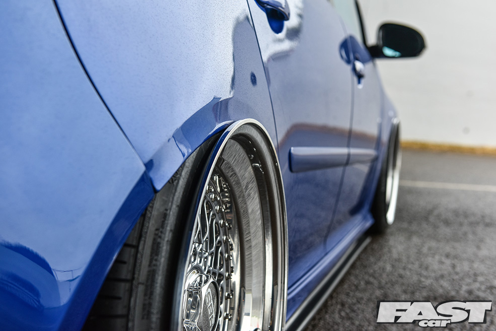 “I wasn’t too impressed with the condition of the bodywork, but it served me well as a daily, and I eventually got the bumpers, roof, bonnet and wings re-sprayed in the standard hue when things got more serious,” Danny continues, explaining how his relentless hunt for perfection began when the project was stepped up a notch a few years into ownership. Because after a bit of dabbling with basic modifications, he employed Car Audio Security in nearby Hayes to get the car rolling on air suspension, giving him far more options in the stance department and marking the start of the transformation the car’s received today.