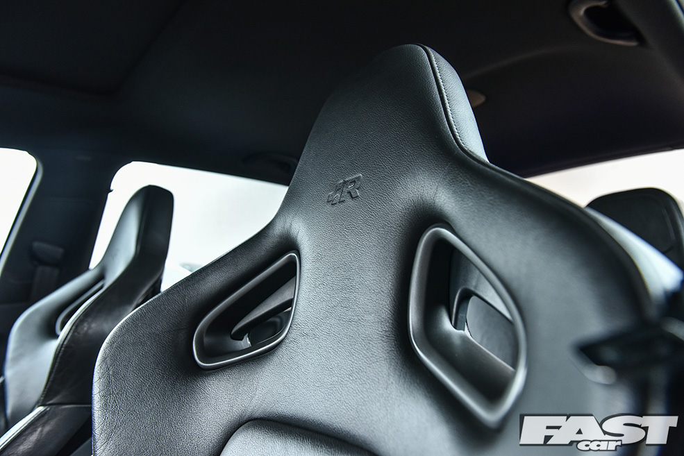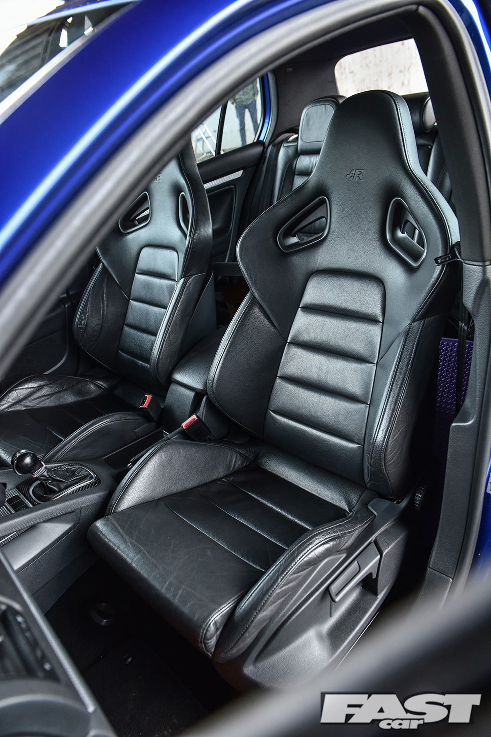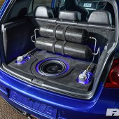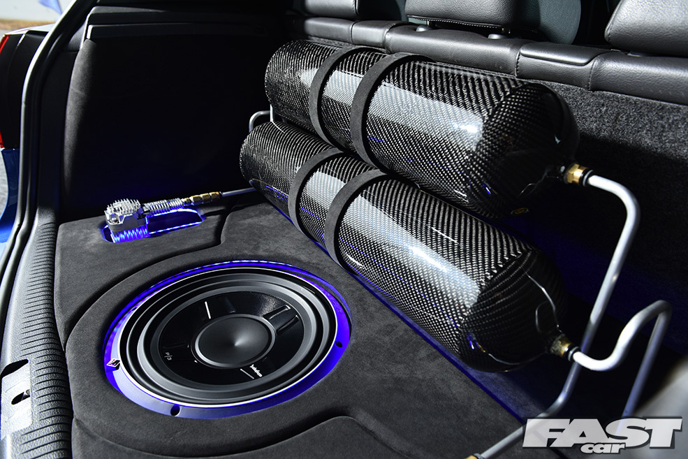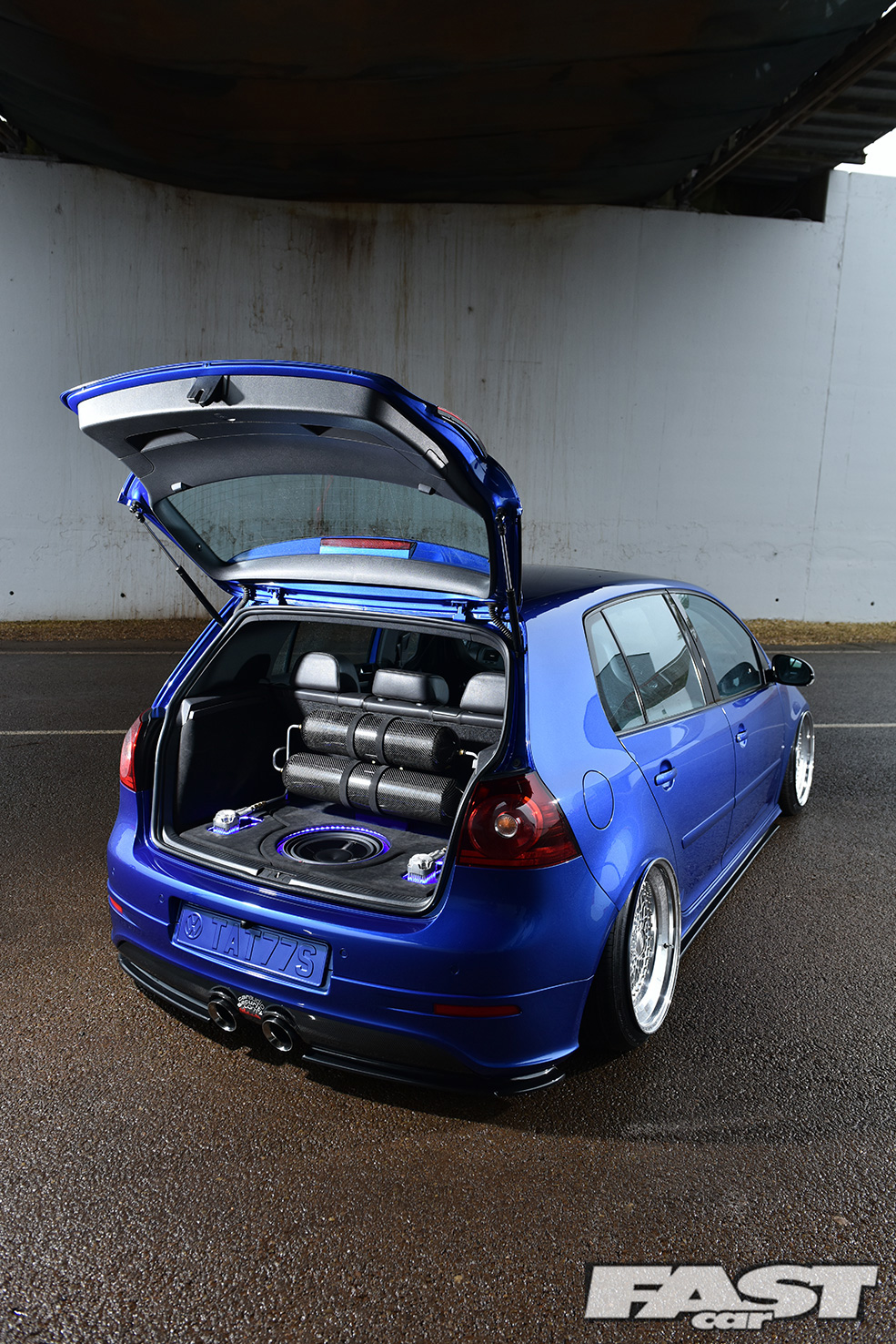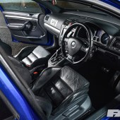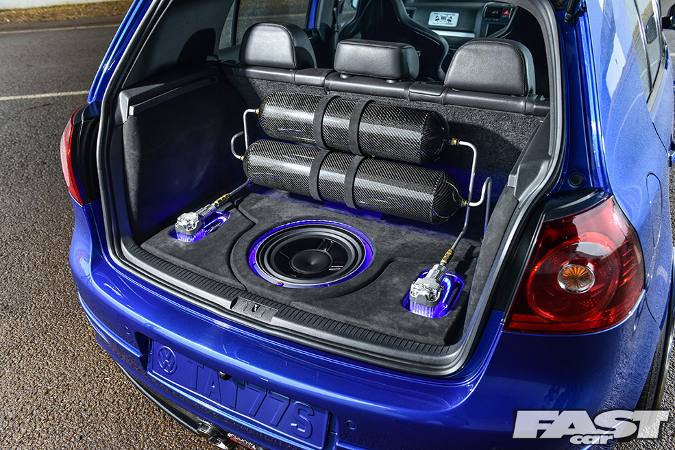 R32 Recaro ‘Wingback’ bucket seats; full boot install (featuring Alcantara-covered twin carbon fibre air tanks, twin compressors and Rockford Fosgate P3 sub-woofer); Kenwood 8160 touch-screen head unit.