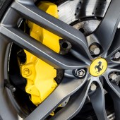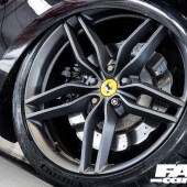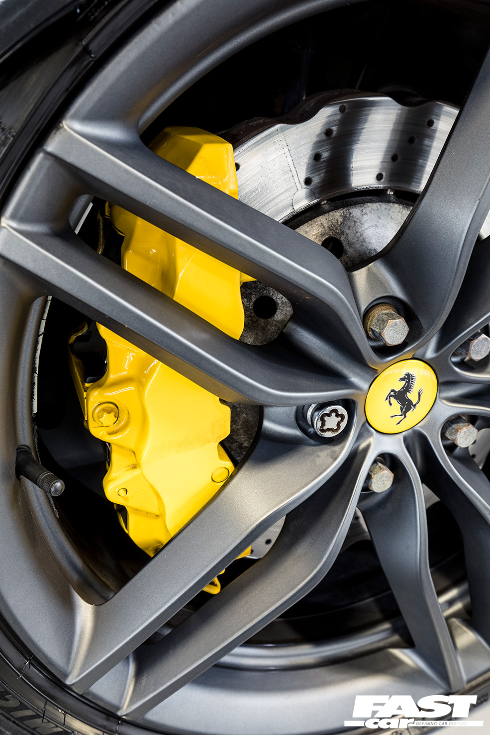 8.5×20” Ferrari FF wheels, 235/35 Michelin Pilot Sport 4 tyres, Air Lift Performance suspension with 3H management, Lamborghini 8-pot front calipers with Audi RS4 365mm wavy discs, RS4 324mm rear discs.