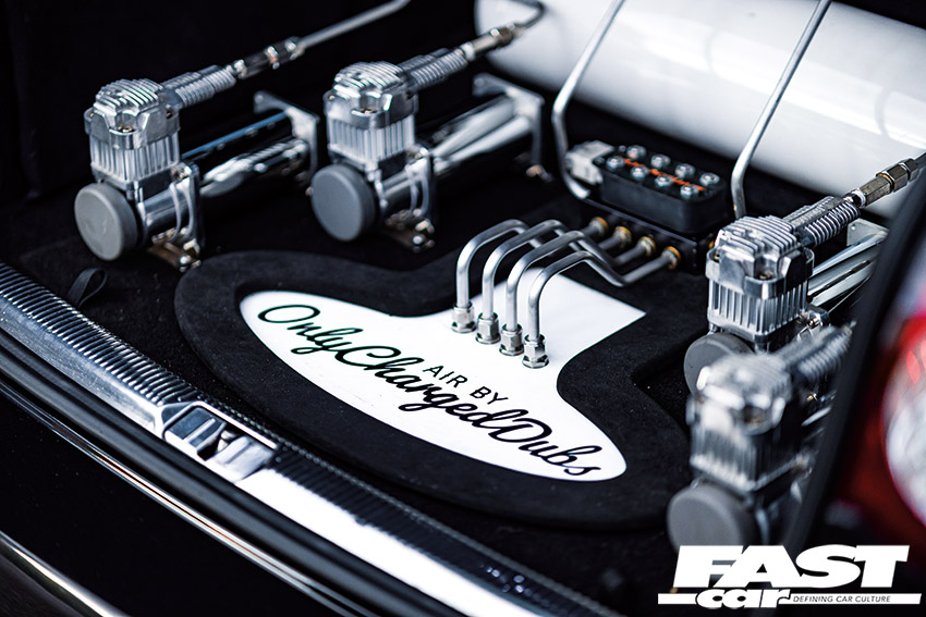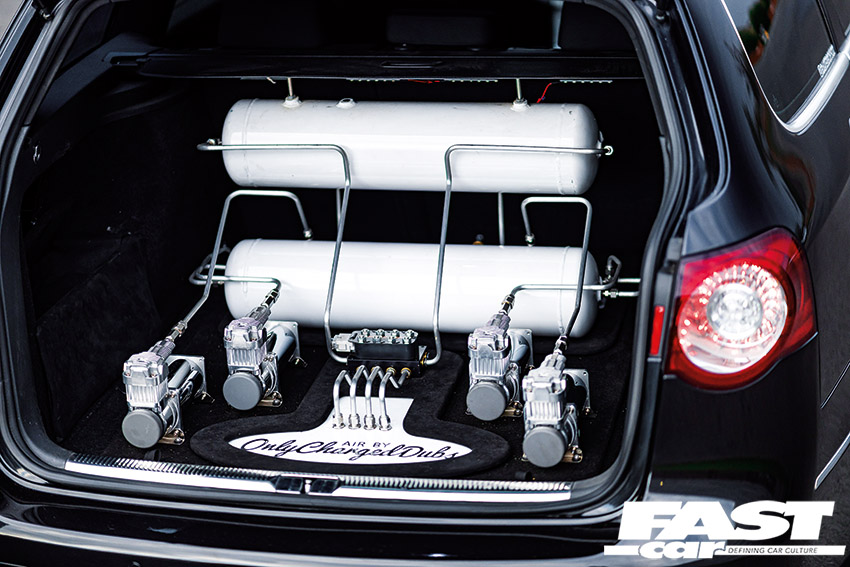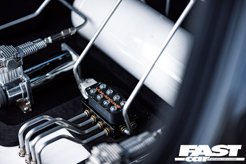 Nice when things work out, isn’t it? And the relentless rollercoaster of success just kept on rolling. The air-ride setup is a bespoke mix of Air Lift components, AccuAir management and a boot build by Only Charged Dubs, with Liam future-proofing the system by using quality braided lines throughout. With the drilled and grooved discs and calipers painted, the stopping power is usefully improved, and he has further plans to swap in a full Porsche Cayenne brake setup in the future.