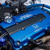 ENGINE: 1.8-litre, 4-cyl, 16v B18C4 turbo, Racetech 500bhp turbo kit, TD05 twin-scroll turbo, tubular exhaust manifold, Turbosmart Compgate 40mm external wastegate with bonnet exit screamer, custom 3in downpipe into a 3in KTuned turn-down bumper-exit muffler, Racetech inlet, 750cc Grams injectors, AEM fuel rail, AEM fuel pressure regulator with Sytec gauge, Skunk2 70mm throttle body, Skunk2 thermal throttle body gasket, Tegiwa thermal inlet gasket, 4-port oil catch can with an12 fittings block and rocker, Japspeed radiator, TT Racing silicone hoses, Hasport engine mounts, Skunk2 dress up kit, wire tucked bay, black VHT painted engine, Arden blue rocker cover, Epman flush fit bolts, Spoon reservoir socks