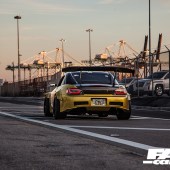 D2Racing coilovers with Stanceparts aircups, Viair 440cc air compressor, viair 2.5 air tank, Megan Racing front and rear camber arms, custom 4-piston front calipers, drilled and slotted discs, 13-inch Ballade Sports drilled and slotted rear discs, 18×11-inch Avant Gard F110 wheels with matte black face, gloss black barrels and gold hardware, Firestone Indy 500 tyres