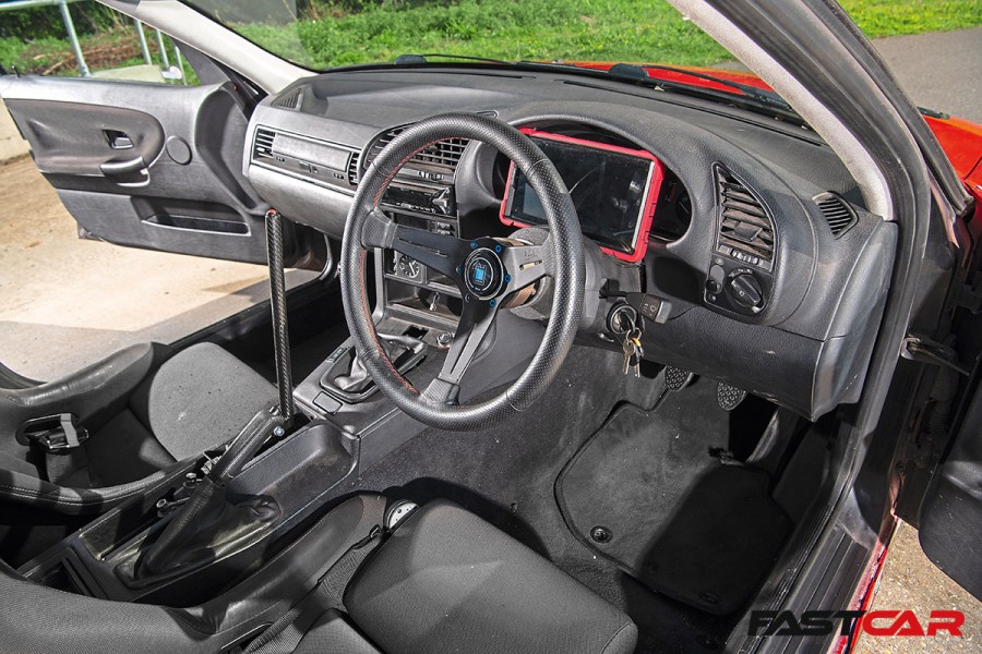 Finally, we come to the interior, and while Scott has added the usual track car equipment, it’s a little less barren than you might expect. “I fancied something a bit more comfortable than a fully stripped-out car,” he reasons. “This still has a full interior, with Corbeau bucket seats and a half-cage for the harnesses to attach to,” and those Corbeau Clubsport XLs have been paired with Takata harnesses. Ahead of Scott sits a Nardi steering wheel on a quick-release boss, and the stock gauges have been replaced with a tablet dash. Scott’s also got a short-shifter and a hydro handbrake in here, while the aforementioned cage takes up the rear of the cabin, and it’s been finished in a rather lovely rainbow flake.