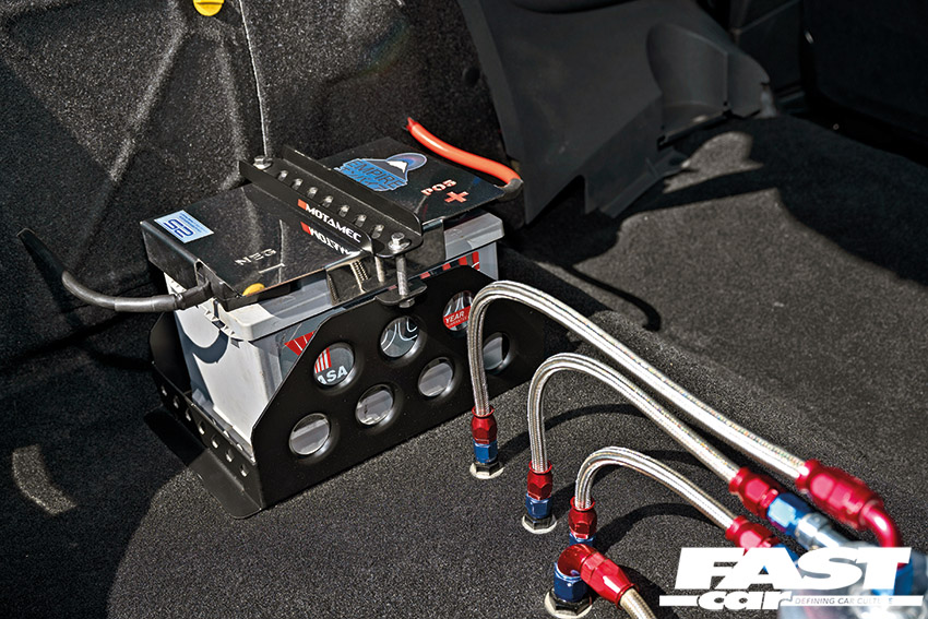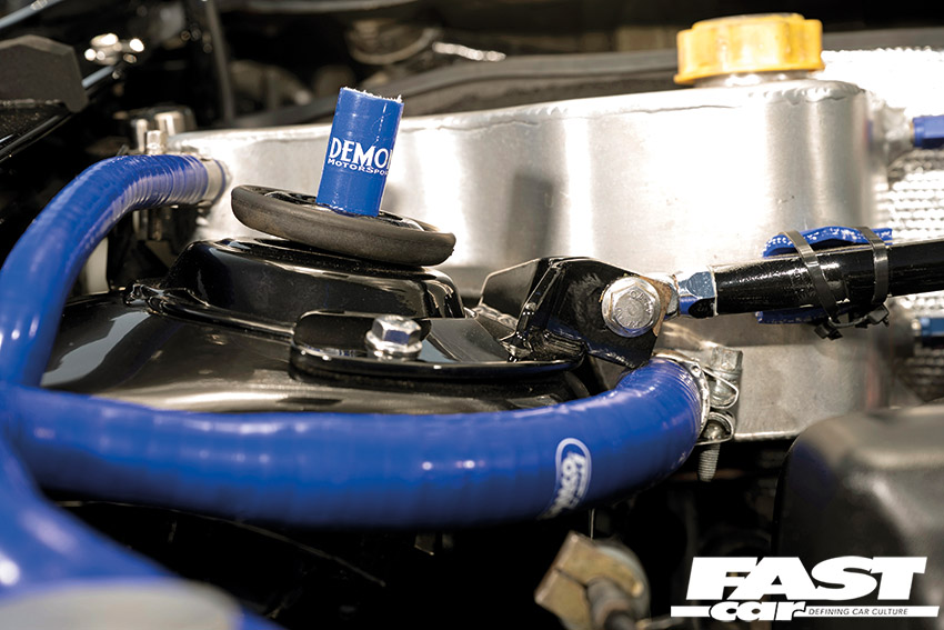 Front: Mk1 Focus RS brake callipers with Reyland two- piece 324mm discs; rear: Racing Puma callipers with Reyland Mk1 Focus two-piece 280mm discs