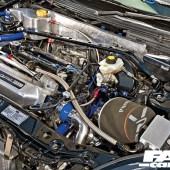 It took Sam a few years to save up for and stockpile the components required, and if you check out the spec list you’ll see neither he nor Lightning Motorsport were messing around. Steel liners, along with forged rods and pistons, give the bottom end a fighting chance with boost, and the head benefits from custom cams. A custom fuel rail with 660cc injectors hangs off one side, and a GT28R turbo mounted to a tubular manifold hangs off the other.