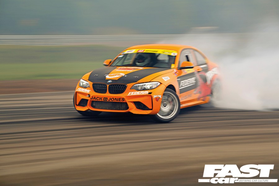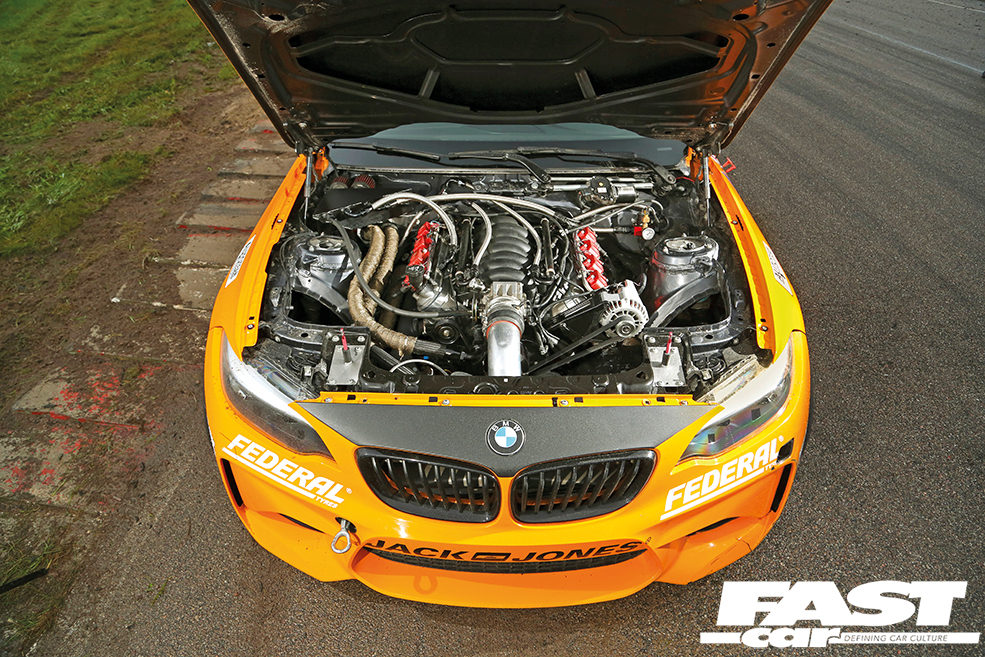 Where you might expect to see a drift car covered in all sorts of scoops and wings, Fredrik’s M2 has been left completely stock on the outside, bar the addition of lightweight windows, but as it is an M2 that’s no bad thing and, covered in the wild orange colour scheme of his Mad Croc energy drink sponsor, it looks pretty spectacular. The interior, on the other hand, bears almost no resemblance to the original M2 cabin, with everything recognisable having been unceremoniously stripped-out and replaced with exactly the kind of full-on race setup you’d expect to find in a competitive drift car. First of all, there’s a full FIA-approved roll-cage, with a rear closeout that covers the rear cabin area and blocks off the rad from the cabin. A pair of Sparco Ergo seats, with removable head bolsters to allow Fredrik to see where he’s going once sideways, have been installed with matching Sparco five-point harnesses. There are lightweight carbon door cards, a QSP steering wheel, a Racepak digital dash display, dual Zeitronix digital wideband AFR gauges, a digital gear indicator, Wilwood pedals and an RFS Performance CNC hydraulic handbrake. There’s some seriously high-end gear in here, but you don’t win at motorsport by counting pennies and cutting corners, so it’s no surprise that Fredrik has gone all-out in here, as he has done at every stage of this build.