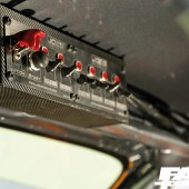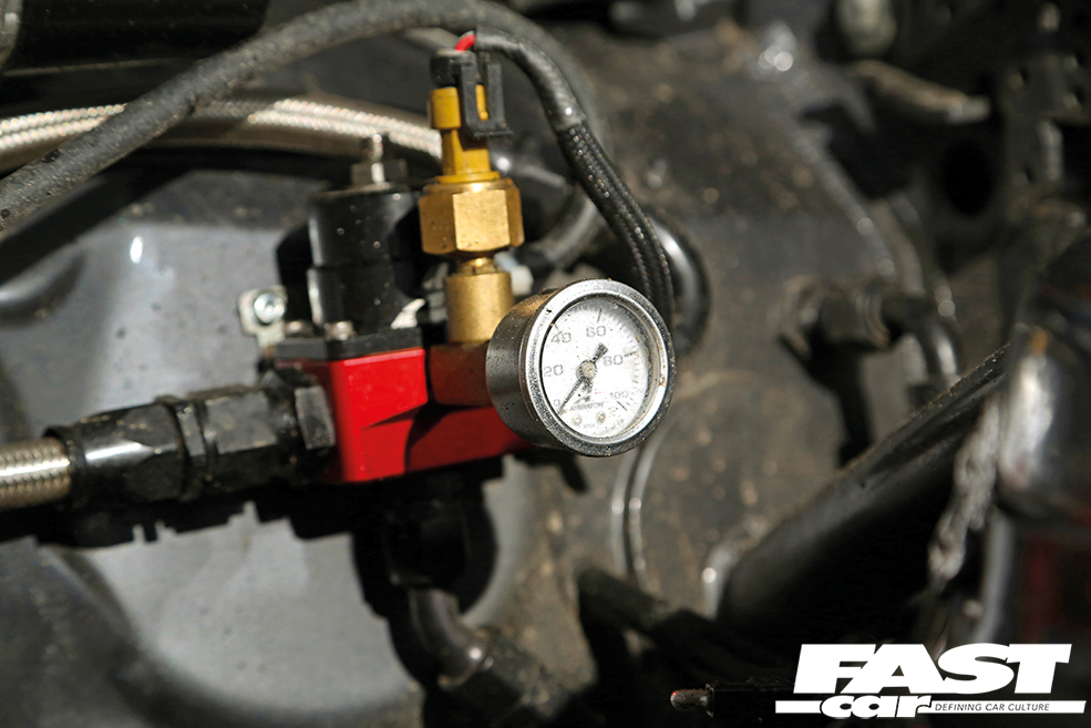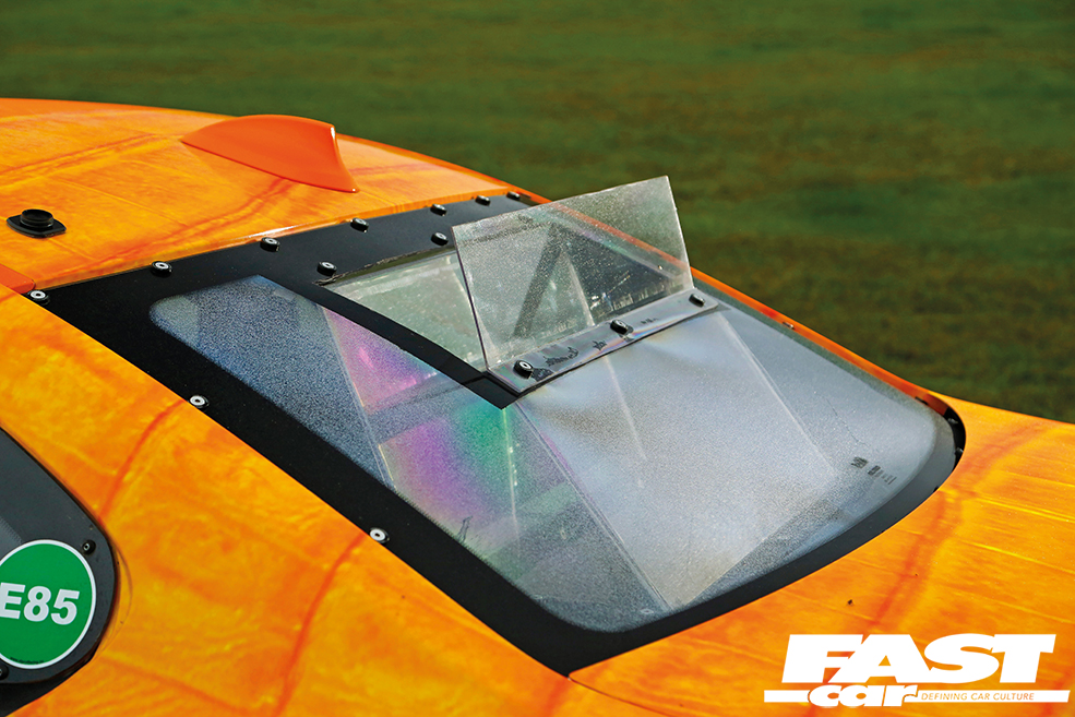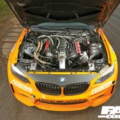 6.2-litre V8 LSX376, 2x Precision 6266 turbos, K&N air filters, Tial wastegates, 2200cc Injector Dynamics injectors, MSD coils, Aeromotive FPR, custom exhaust manifolds, Autronic SM4 engine management, rear-mounted Griffin radiator with rear window air scoop. Samsonas five-speed sequential gearbox