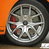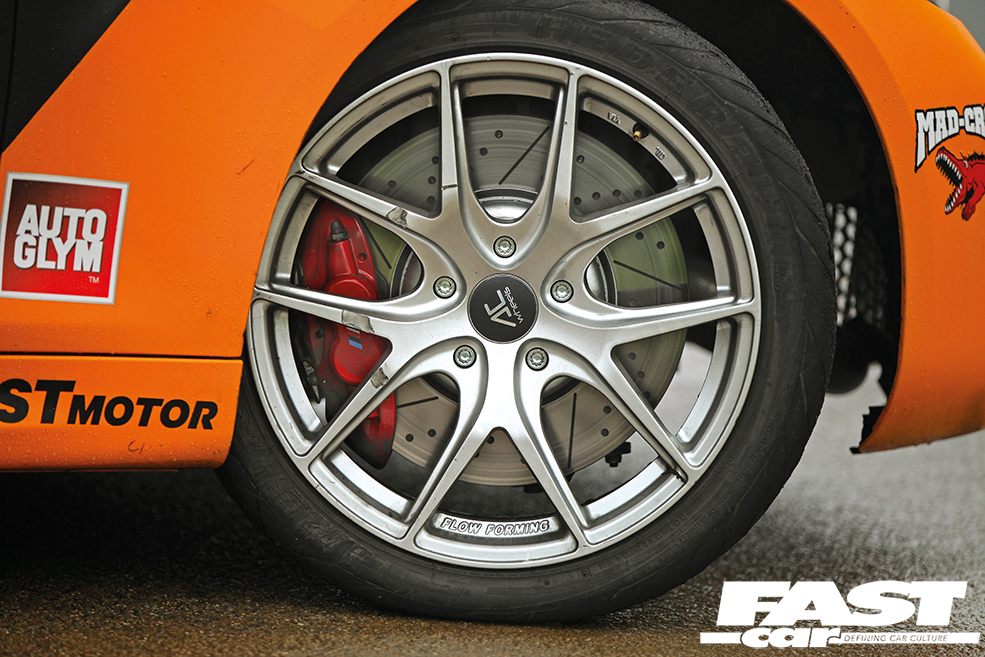 10×18” (F&R) AC Wheels flow formed FF007 wheels with 265/35 (F&R) Federal RSR tyres, Nitron remote-reservoir three-way coilovers, Wisefab suspension arms and hub knuckles, red calipers, slotted and dimpled discs