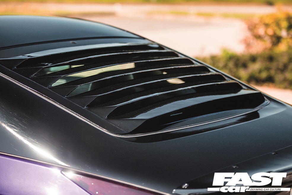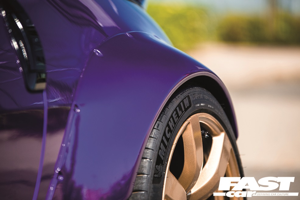 With the kit painstakingly fitted to TRA-Kyoto perfection by the KR craftsmen, they added their own proprietary carbon bonnet before slathering the body in an eye-catching and sumptuous shade of creamy custom-mix Cadbury’s purple – an ironic choice, given Dan’s health-oriented lifestyle; we imagine his chocolate intake is pretty limited, so perhaps this vibrant colour allows him to live out those Bournville fantasies in a more vital sense. The footprint of the car is vivid too – naturally the Rocket Bunny kit creates some sizable arches to fill, and it was always the plan to fit the R35 GT-R wheels which are aggressively sized at 9.5×20-inches. To get the body hunkered down properly and allow those vast rollers to fully inhabit the newly-crafted housings, the KR team subbed in a fresh set of Tein Flex Z coilovers, and we have to say the effect is outstanding. Every inch of this Zed is gloriously absurd, in the best possible way; it refracts the established Zed-car form through a fresh and vibrant filter.