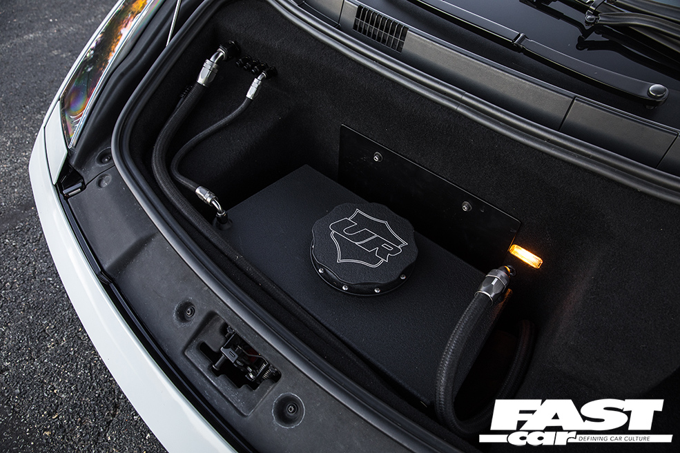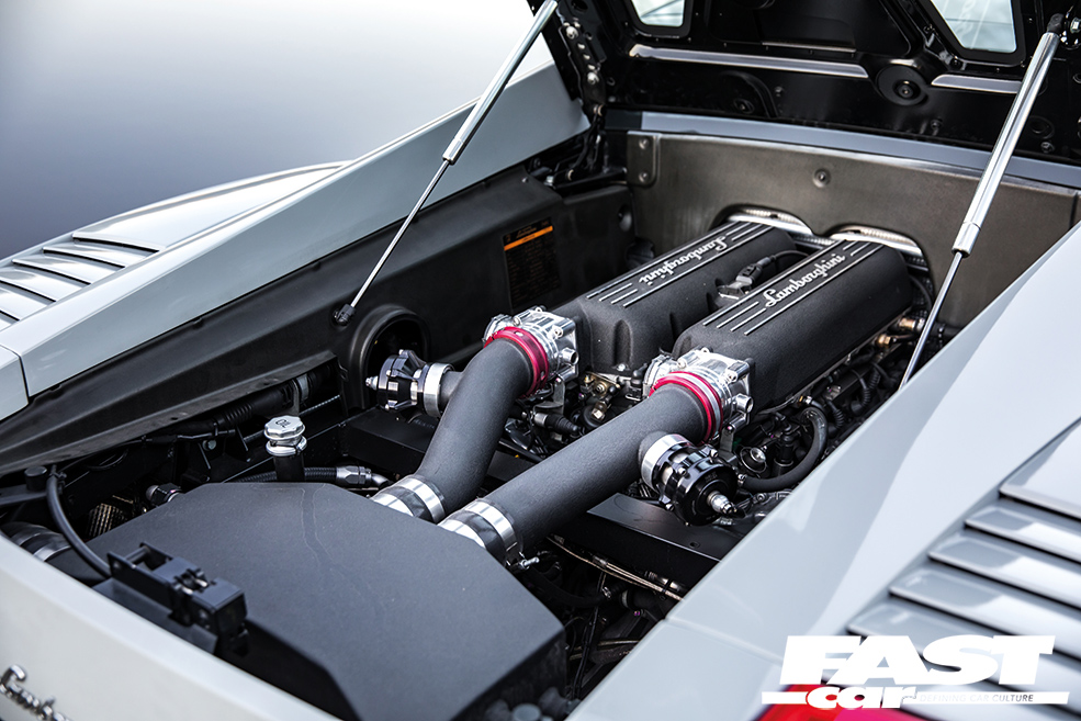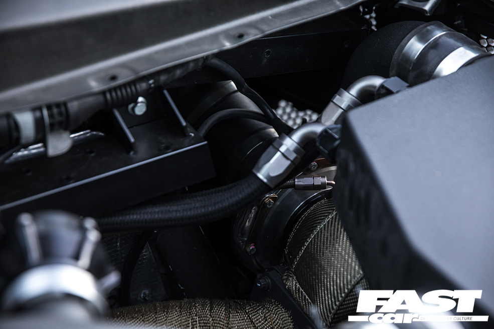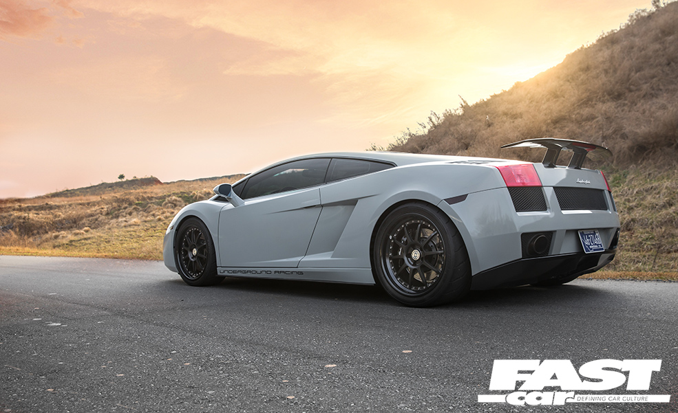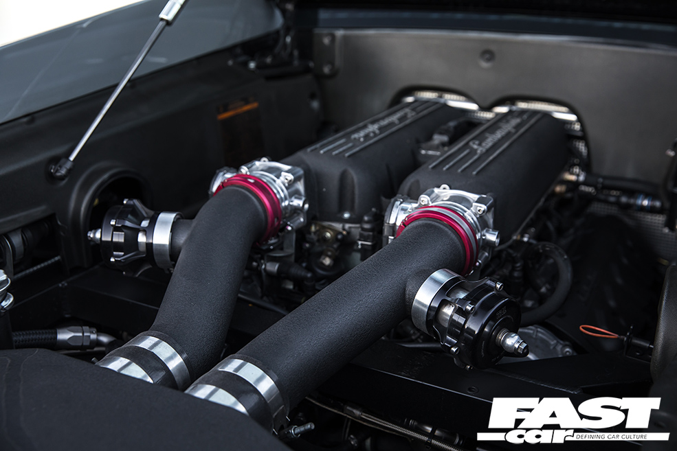 But even this act of certifiable craziness wasn’t sufficient for Moe’s heady aspirations. He didn’t want to just be ludicrously fast – he wanted to be so fast that nobody could catch him. So he’s worked closely with Underground Racing to tailor a unique and eye-watering spec for his Gallardo, side-stepping the mainstream menu and going à la carte. The engine has been blueprinted and features twin billet 62mm Precision turbos, Tial billet wastegates and BOVs, and a custom-fabricated stainless steel exhaust system with ultra-lightweight silencers. It inhales through a mighty stainless steel ram-air induction arrangement with hungry K&N filters, and inside the block reside custom CP reverse-dish aluminium pistons with Carillo rods and custom steel cylinder sleeves.