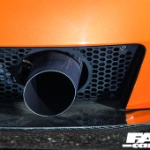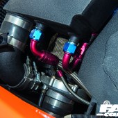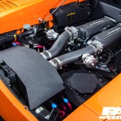 Now for the magic. Custom twin billet 67mm turbochargers are installed directly in front of the rear bumper and behind the engine. Tial billet wastegates and blow off valves help release the pressure and a custom 3.5inch stainless steel exhaust using aircraft quality metal is used to carry the gasses away. The sound is mildly deadened by ultra-lightweight mufflers, while airflow is controlled by a custom built air intake. The exhaust itself is heat wrapped to keep temperatures inside the engine bay to a minimum.