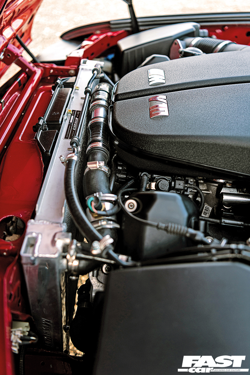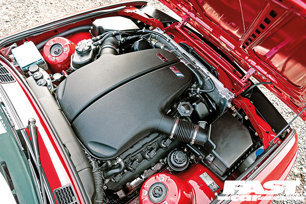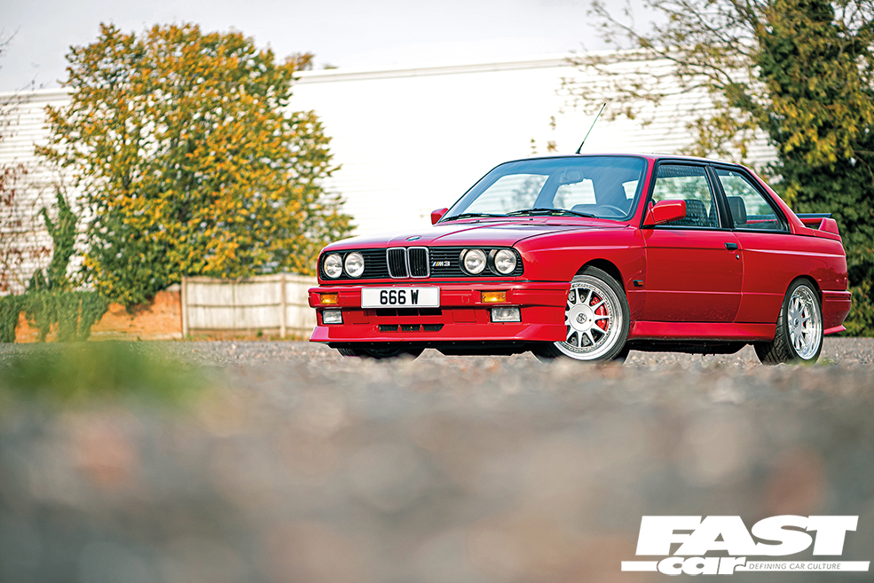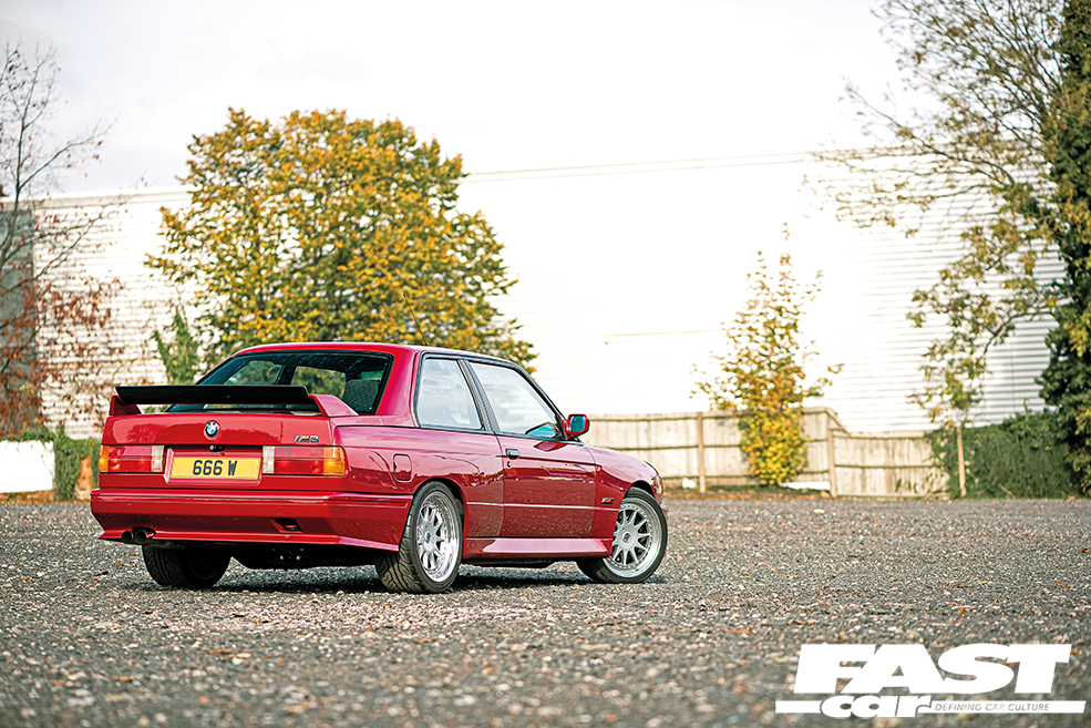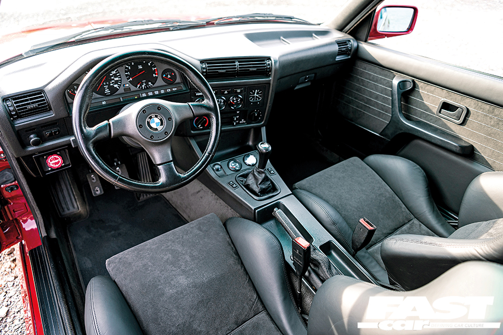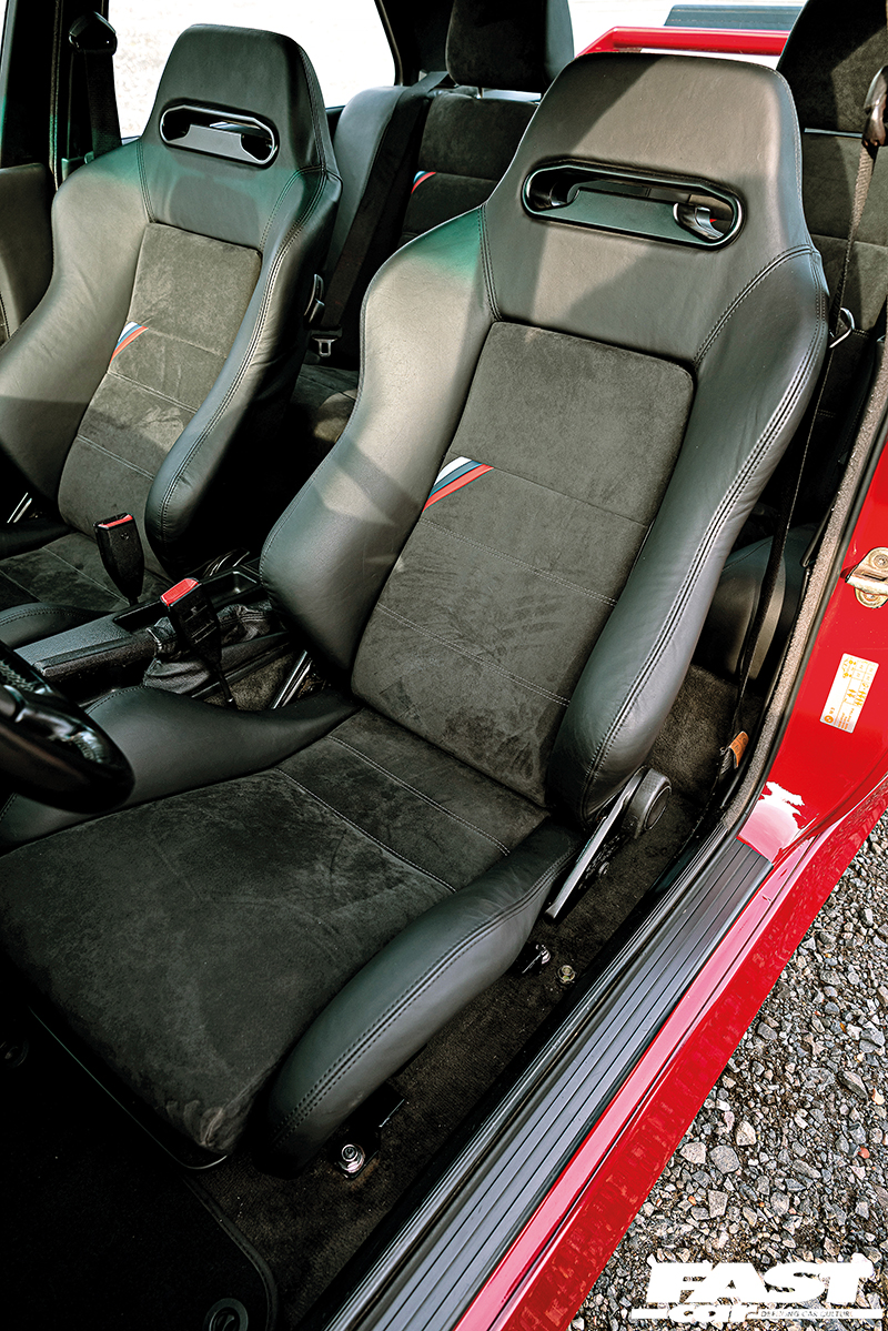 In terms of styling, this build is very much an exercise in restraint in almost every single area, with only a few subtle additions that help to accentuate the car’s natural muscularity. It feels like we’ve definitely been enjoying some more OEM+ builds in the mag recently, but when they’re based on classic beauties like this it’s only ever a good thing. On the outside, you’ve got that dazzling Imola red bodywork and the very subtle additions of an Evo 2 front spoiler and a Sport Evo rear item, and they combine to just give the car that little more presence and aggression. The wheels, however, make a big statement and while they may be period-perfect for this car, that doesn’t make them any less dazzling. “Initially the car had Style 5 two-piece split rims,” Keith tells us, “I repainted and polished them and ran those for a few years. I fancied a wheel change, so I bought a set of BBS Le Mans splits and then, while waiting for a pair of 9” barrels to come up, these Hartge rims appeared and I bought them. I had them repainted in two-pack paint and polished them myself, which was a very time-consuming task,” he says but the end result was most definitely worth it. The wheels are 17” Hartge Type C three-piece splits, one of the most perfect wheel choices for a classic BM, and they look so good on this car with their polished stepped lips and just suit the whole aesthetic perfectly.