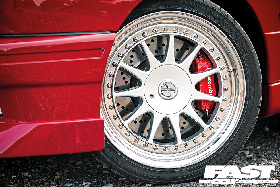 8×17” (front) and 9×17” (rear) Hartge Type C three-piece wheels with 215/40 (front) and 235/40 (rear) Yokohama Advan Neova AD08R tyres, coilovers, custom-fabricated front subframe, refurbished E31 8 Series Brembo four-piston calipers and 325mm E46 M3 discs (front), Porsche four-piston Brembo calipers and 296mm vented discs (rear)