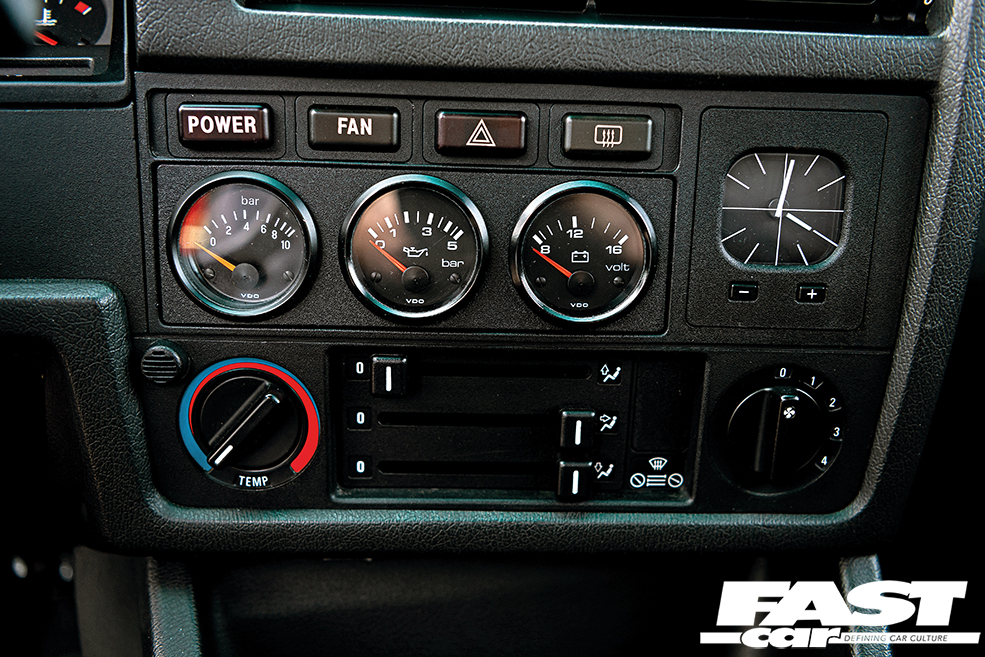 The interior, meanwhile, has a little bit more going on but it too is very much in keeping with the whole style and look of the car and it all works together so well. “The interior has been through a few changes,” Keith tells us, “initially it had black leather Recaro SRDs with a black leather rear seat and I then fitted some Corsa VXR front seats. Ata Khan from the E30 Zone then sold me his retrimmed, unused interior out of his S62-powered E30 M3 after he decided to go down the track car route. I have Recaro SRD seats up front and the whole interior is trimmed in black leather with Alcantara centres, including the door trims, and an Alcantara rear shelf,” he says and it looks stunning. The SRDs look so good in the E30’s cabin and the leather and Alcantara combo is a stunning one, with the M tricolour logo details on the front and rear seats adding that little special touch, and the doorcards are no less beautiful. There’s also a Nardi Blackline steering wheel and no less than five additional gauges – in the centre console sit three for the fuel pressure, oil pressure and voltage, while ahead of the gear lever are two for the gearbox and diff oil temperature. Aside from that nothing else has been added but what’s here is enough to make the interior feel special and nothing else was needed, this is perfect.