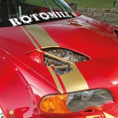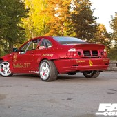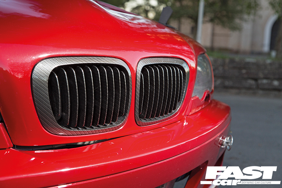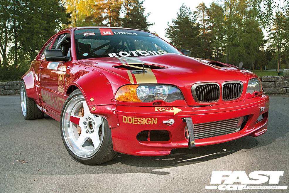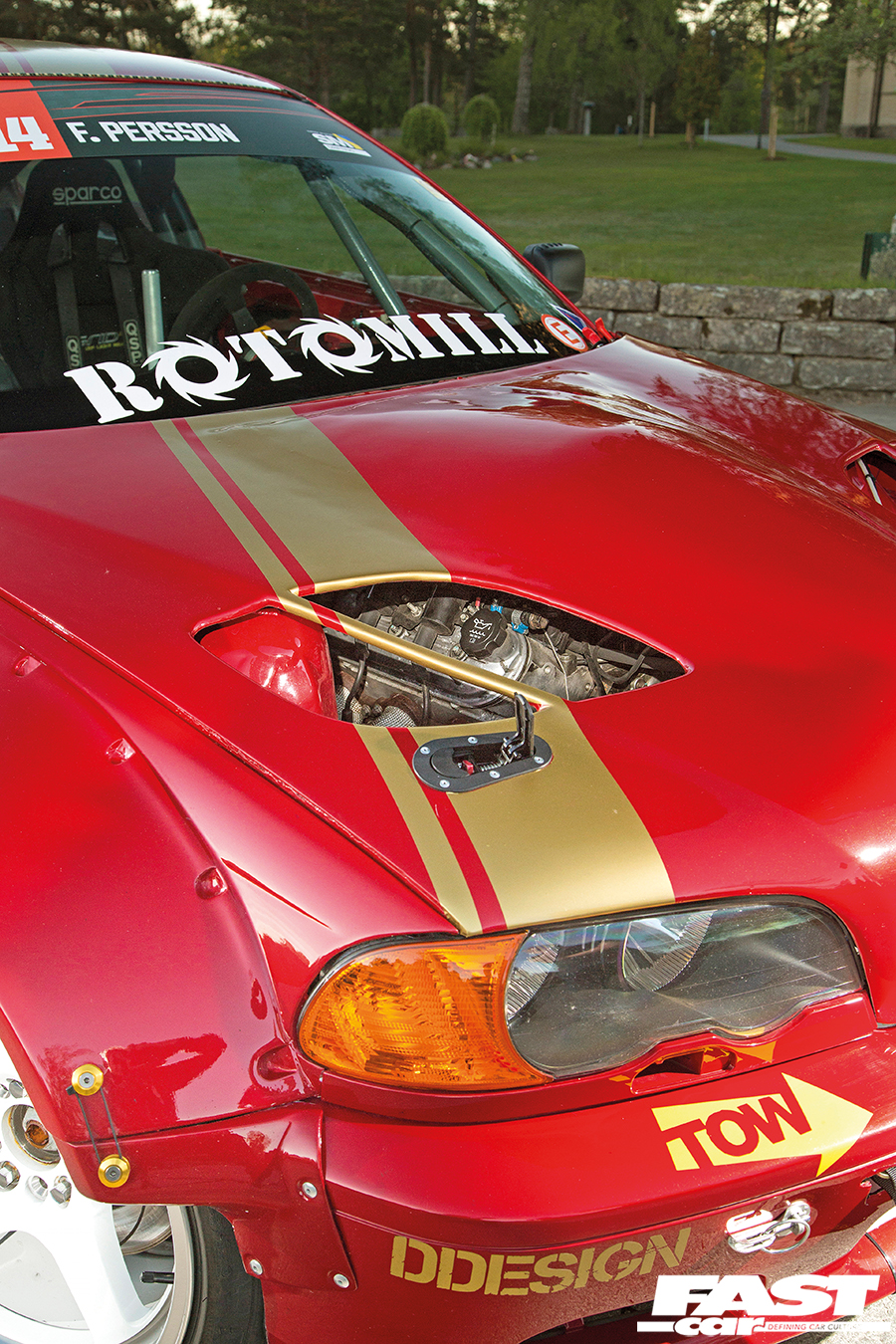Much as with the wheels and the rest of the build, the aesthetics of any drift car are largely dictated by the practical requirements but that’s not to say that appearance isn’t an important part of even the most serious track build. In the case of any motorsport machine, it’s all about ensuring that your car stands out on track and really gets noticed, and that’s something this E46 does with ease. “Even though this is a drift car we really like to keep it nice and shiny,” grins Fredrik, “and we decided to go with a Rebew Design body kit painted in Hyundai WR3 red,” and that kit makes a big statement. The bolt-on arch extensions are massive and absolutely outrageous and give this BMW E46 ridiculous presence, and the red and gold colour scheme applied across the exterior works really well. The bonnet is a custom item designed through necessity because, as you can see from the photos, the engine barely fits in the E46’s bay so a massive central hump had to be added to clear the intake manifold, and there’s obviously a hell of a lot of vents cut into the bonnet to aid with cooling because a massive engine like this V8 along with that huge turbo is going to chuck out a load of heat. There are carbon grilles, the driver’s side headlight innards have been removed to accommodate the intake for the turbo, leaving just the lens cover intact on the outside, there are lightweight windows and, speaking of lightweight, the entire rear end is made of plastic.