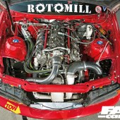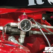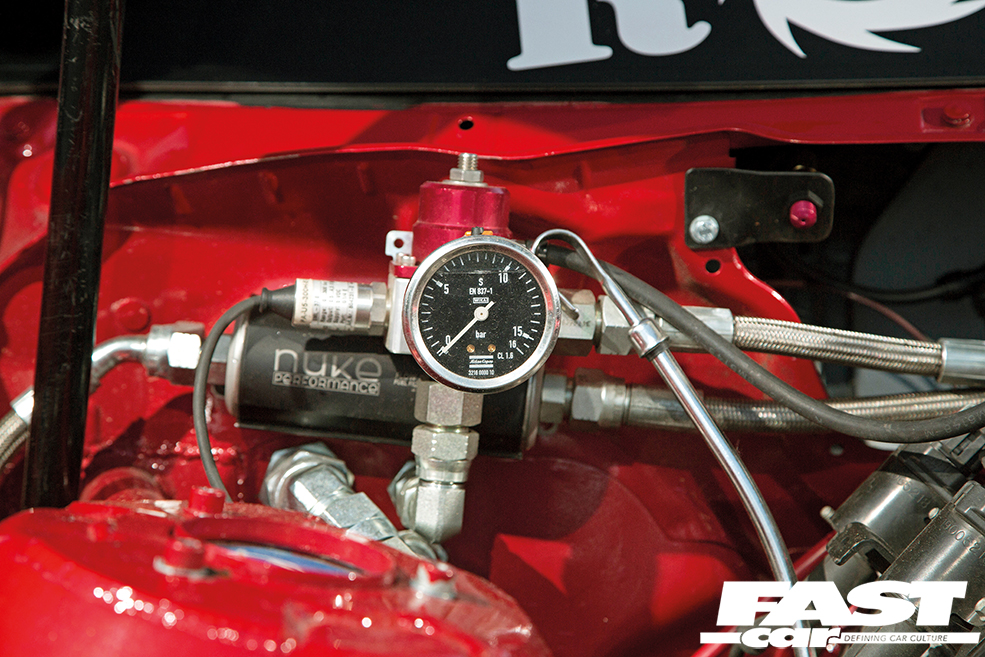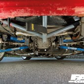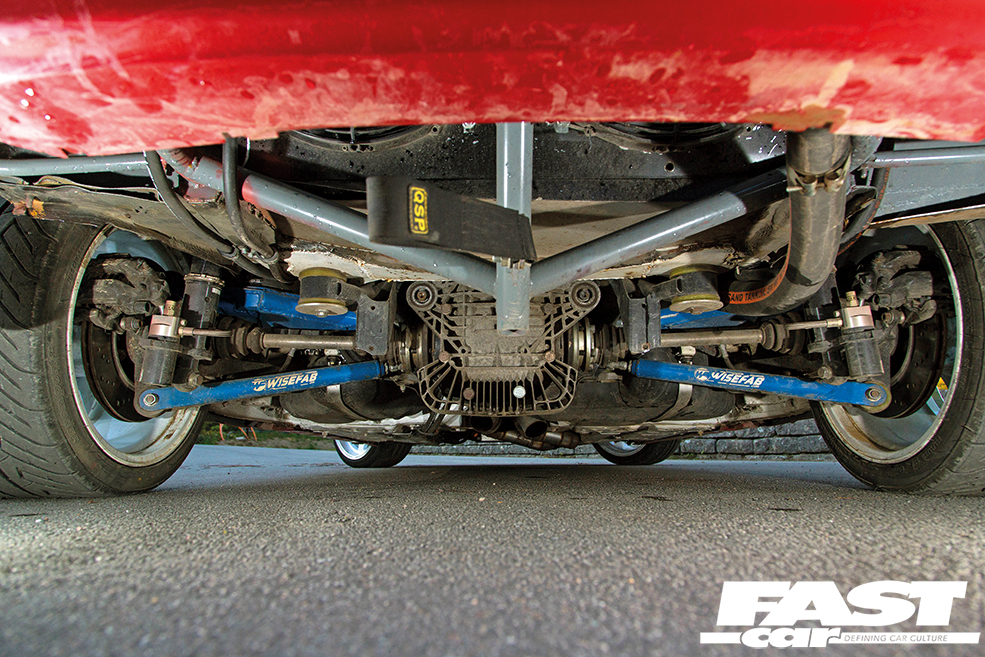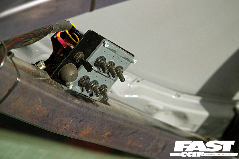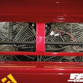 “With the rad in the back, there’s a huge cutout to allow air to flow into the boot down the rear window and a pair of huge fans helping to pull as much air through it as possible, and that works a whole lot better on a drift machine.”