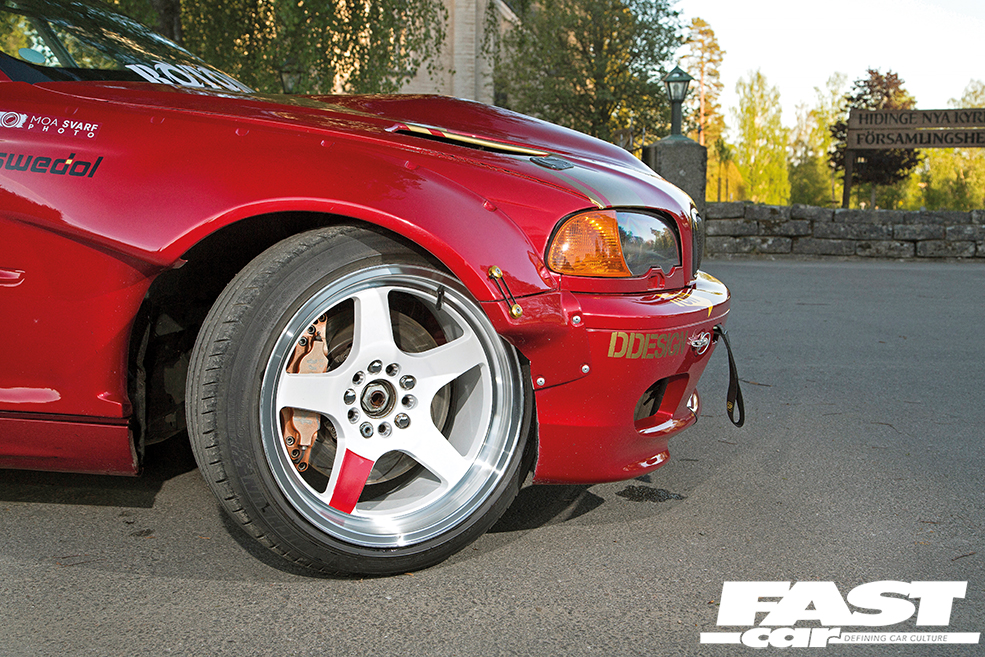 Any track build, regardless whether it’s been designed to be as fast as possible around a circuit or to travel around it at the most obscene angles imaginable, is wholly reliant on its chassis to deliver what its driver needs, so it’s a core area that you can’t scrimp on and the Persson bros. have put in plenty of work to ensure that the setup on their E46 can deal with all that power and deliver drift perfection. “We chose BC Racing HR coilovers with Wisefab adjustable control arms and steering angle kit,” explains Fredrik, “and we chose this setup because it helped us get the grip levels we want when drifting,” making it the perfect choice for this build. While huge power and a hardcore chassis are essential components of any drift build, you also need some serious brakes because of the massive power levels involved, and this E46 certainly delivers when it comes to stopping power, packing massive eight-pot K-Sport calipers up front with M3 calipers at the rear and Endless pads at both ends. On any street BM we feature we would always say that wheels make the car, but when it comes to a track machine style definitely plays second fiddle to a wheel that’s fit for purpose. “We wanted something that could take a beating but without costing a fortune, so we ended up with 59North Wheels D004 9.5x18s,” says Fredrik and this Swedish offering has that classic JDM-inspired drift and track look that suits the car perfectly, but most importantly they are tough enough to deal with the huge stresses and strains that drifting places upon them.