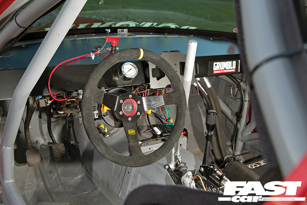 Sparco racing seats, QSP six-point harness and suede steering wheel, oil pressure gauge, Coolerworx shifter, Suvi Performance hydraulic handbrake, full roll-cage