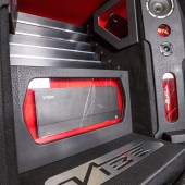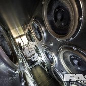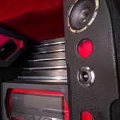 Spearmint Rhino-style enhancements aside, the business end is the 30mm thick, fibreglass-reinforced plywood enclosure. Braced on the inside with 14mm steel bars, it houses the 12 ‘Bubonic’ 15-inchers that produce the majority of that awesome sound pressure. Designed as a giant fourth-order band-pass enclosure, the guys even had to fly in a team from Italy, including Danny Boy from Team Bull Sound, to help with its construction.