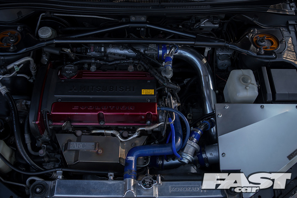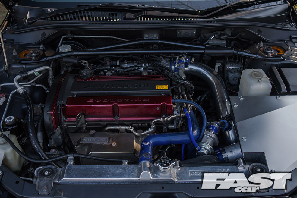 2.0L 4G63T I4T; Tomei Arms 7960 Turbine; Tomei 660cc injector; Tomei 255L fuel pump; HKS Racing plug No. 9; Rallyart plug code; HKS Vpro; HKS EVC 6; Billion fan controller; Okuyama intake kit; Samco turbo hose kit; ARC intercooler; Tomei Extreme exhaust manifold; Tomei Extreme outlet component; Tomei Extreme Tititanium muffler; Tomei blow-off valve.