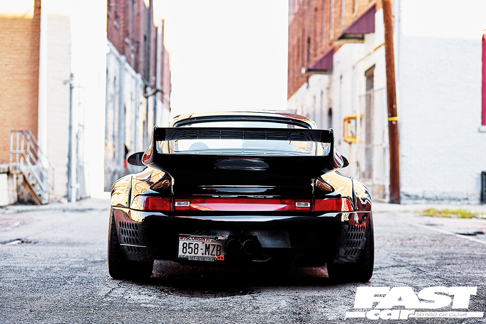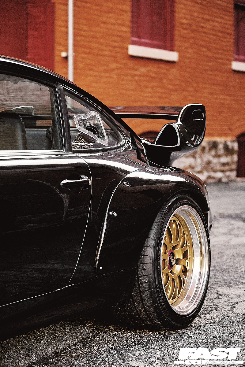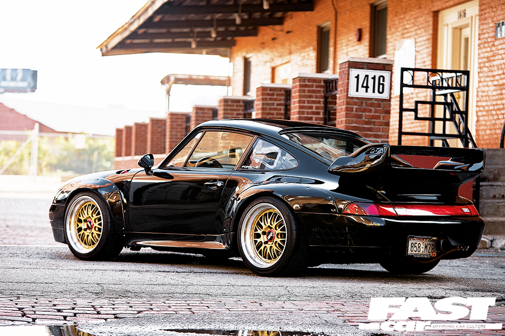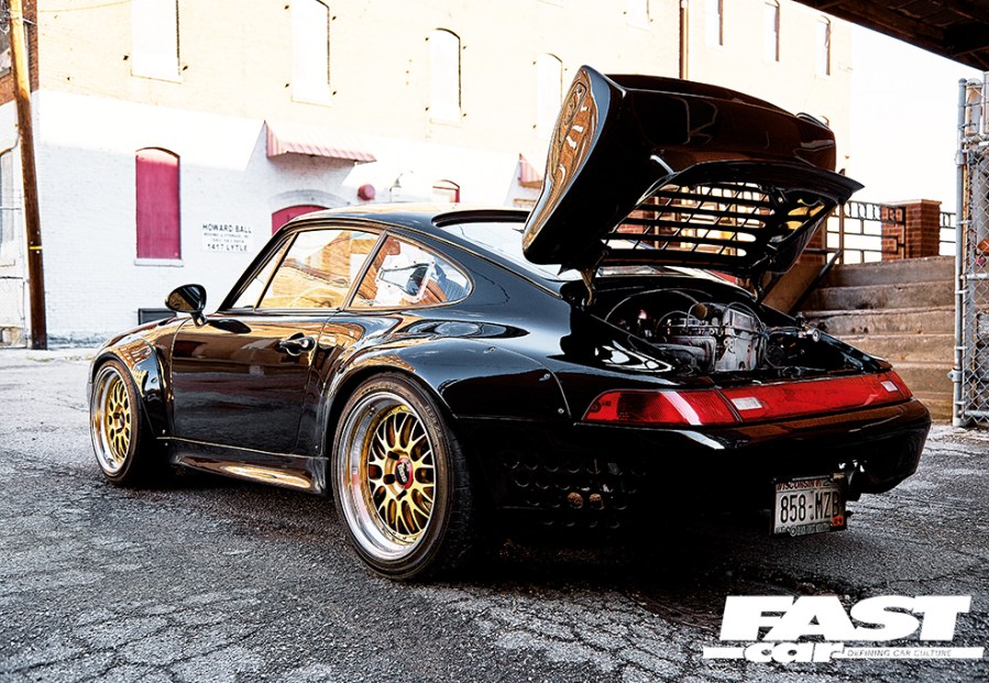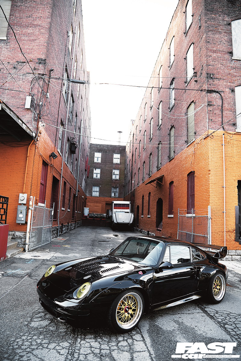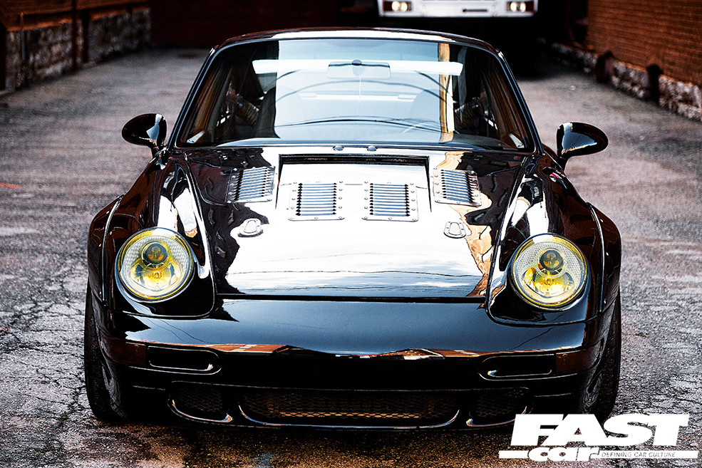 For those of us who still think a man bun is a chip butty with greasy bacon, and are not blessed with a pair of skinny jeans and a beard comb, the car on these pages may need a little introduction. Colonial customiser Bradley Black has bolted together a rather tasty and certainly controversial Porsche 993 – the 1996 vintage machine is no run of the mill Porker though. Those in the know will tell you that the 993 is something very special in the ranks of the Stuttgart stable. The mid to late 90’s variants of the 911 model line are not only the last of the much revered air cooled clan, but are generally reckoned to be among the best effort the company ever put out. For the purist posse owning one is a privilege and cutting one up is… well, just say our man Brad has probably got a band of slightly paunchy, middle aged Rennlist refugees out looking for him. Brad’s not bothered though, “I thought it would make a cool project,” he told us, “something interesting and unique.” Employee at Adaptec Speedware and co-owner of Eurotrash Apparel (along with fiancé Dinah Jean Volante), Black is based in Louisville, Kentucky, a locale that has the distinction for turning out a certain professional pugilist who, like our man’s project “shook up the world.”
