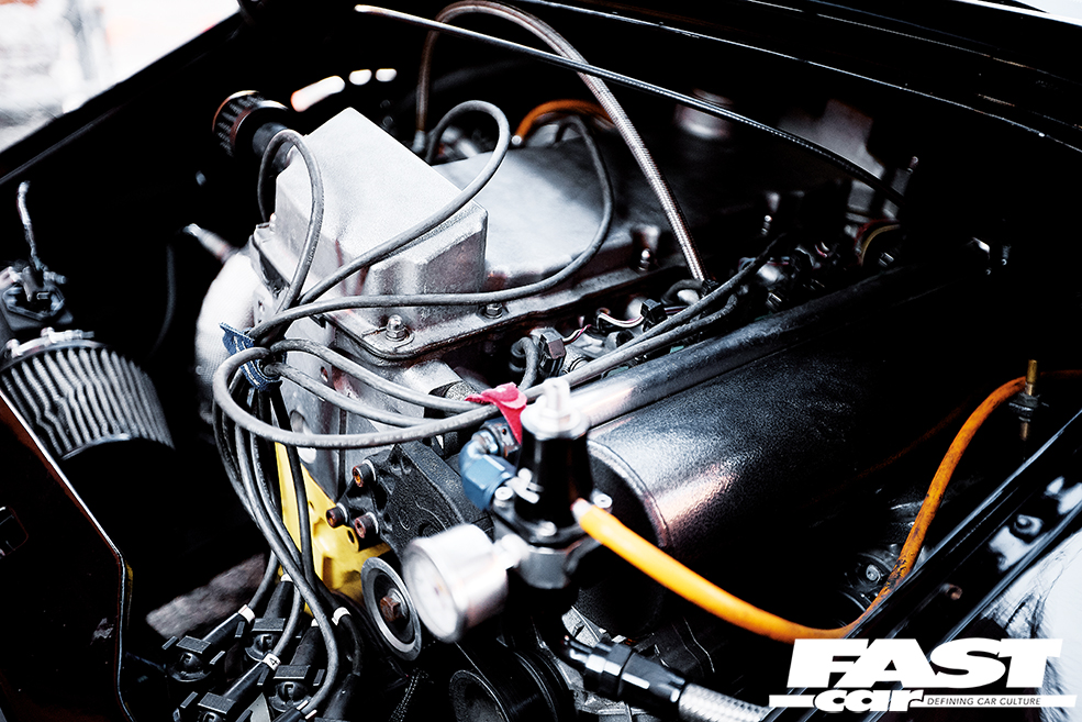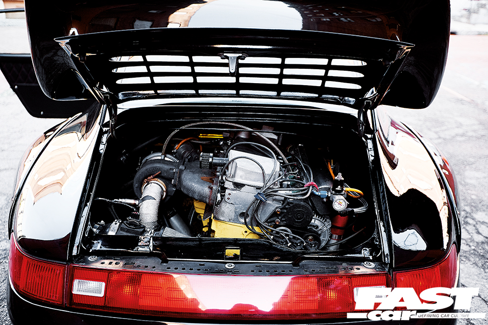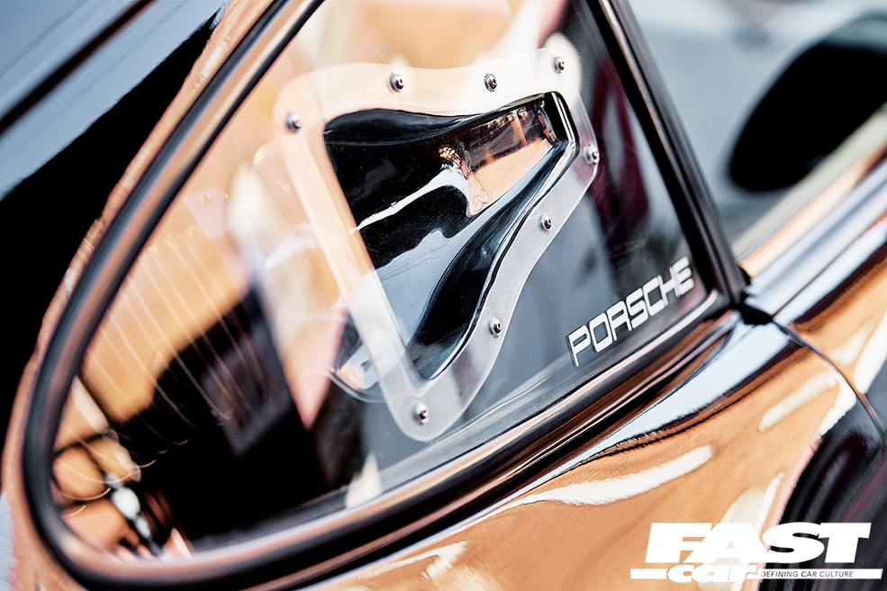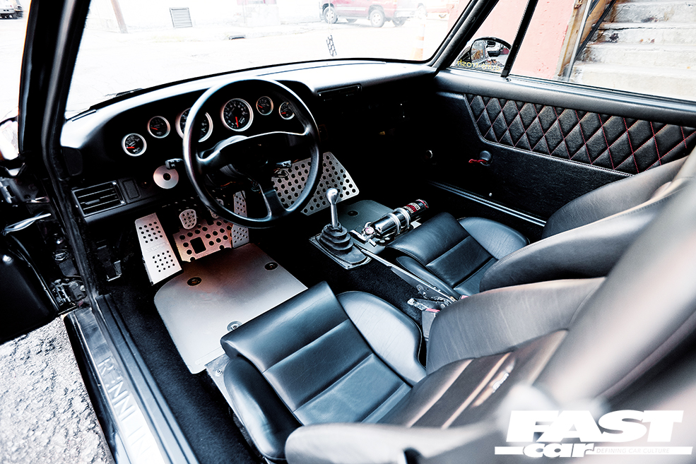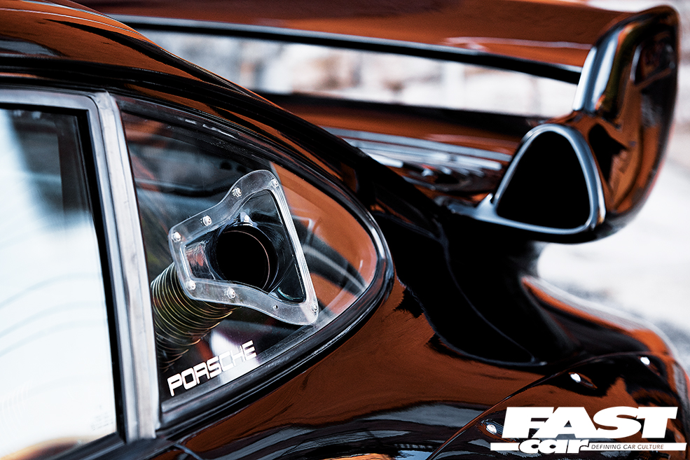 Turning the pile of parts he had amassed into a verified head turner took Brad the better part of two years, well at least to get it on the road took that long, these types of projects are never really finished. The first order of business was to address the bodyshell, initially the idea was to replace the missing bits, repair the damage and straighten out the panels well enough to have a presentable driver. As the project has progressed though the rough and ready has given way to a more tailored and fitted look…although there’s no doubt the character has remained righteously rough and definitely ready. The exterior treatment is now modelled on the fabled Porsche RSR Rennsport cars which Porsche produced to terrorise tracks all over the world. This is no low calorie cruiser, Brad has built himself a fat fendered, track inspired main street menace. All four corners have received portly panelwork to house acres of race ready rubber, which flow into custom turbo style bumpers. With a widebody conversion a huge rear spoiler is almost mandatory and Brad definitely didn’t skimp in the downforce department, bolting on a GT2 bootlid to even out the wide boy proportions. Throwing in a pair of NACA ducted rear quarter widows helps to clear up any confusion that this is s light duty daily driver. With a perfect balance of beauty in the beast there could really have only been one choice of topcoat, “The car was originally Polar silver. I painted it black, no pearl, no flake, just black,” confirmed Mr…Black.