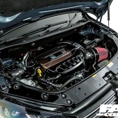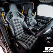 Chris wasted no time and initially focussed on the interior of the new build. Recaro Wingbacks and Touran rear bench were the chosen pews. These were reupholstered in Nappa leather and GTD tartan along with the door cards and upper dash by Optimus Automotive. A MK7 Golf GTI steering wheel recovered in perforated leather and suede is an in-keeping tiller whilst Touran carpets and centre console add luxury to the once spartan cockpit.