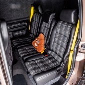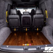 Fully sound deadened and insulated (front and back), rear fully carpeted in anthracite carpet (with ply panel inserts), coffee ash real wood flooring in rear, armour plates on rear doors, Touran rear seat conversion fully heated and reupholstered in Bridge of Weir Leather with Golf GTD tartan centres and suede trimmed plastics, Touran Carpets (front and Rear), Touran seat bases trimmed in suede, heated Recaro R32 Wingback front seats reupholstered in Bridge of Weir Leather with Golf GTD tartan centres and suede trimmed plastics (wired with stans loom), Touran Dashboard upholstered in Bridge of Weir leather and suede, Premium 3D colour instrument cluster with facelift Scirocco dial foils and custom Scirocco facia surround, Scirocco additional gauge cluster mounted in custom made suede trimmed housing, full Touran Climatronic heater/air conditioning system with late model control unit, Custom heater control surround with MK7 Golf satin chrome button trim, CAN bus controlled PTC heater with original VW loom, Caddy life sliding door interior panel upholstered in Bridge of Weir Leather, Golf GTD Tartan and suede, Custom made drivers side rear panel upholstered in Bridge of Weir Leather, Golf GTD Tartan and suede, Shadow chrome door catch covers, Facelift Touran vents and ESP switch unit (satin chrome trimmed), Touran centre console with custom made sliding tray, trimmed in suede with armrest trimmed in Bridge of Weir leather, handbrake trimmed in Bridge of Weir leather with satin chrome release button, yellow seatbelts (front and rear), MK7 Golf GTI gear knob with shortened lever and Bridge of Weir leather gear lever cover, MK5 Golf GTI foot pedals, MK7 Golf R flat bottom MF steering wheel reupholstered in perforated Leather and Suede with yellow stitching and centreline, XHorse steering wheel module, MK7 Golf hybrid indicator/wiper stalks, Passat W8 interior light, auto headlights, white LED door and floor courtesy lighting (door open), red ambient floor, dash and door pocket lighting (front and back), Touran front door panels reupholstered in Suede with Bridge of Weir leather armrests and top sections with Golf GTD tartan door centres, satin chrome Touran Door handles, Touran Satin Chrome mirror switch, VW Beetle Satin chrome tipped window switches, Audi A8 door handle lighting diffusers (red), genuine VW Bulkhead delete B post trims trimmed in suede, lower B-post and sill trims trimmed in suede, A pillars, roof lining & roof trims all retrimmed in suede, custom rear roof lining trimmed in suede with fibre optic star lighting and additional LED roof lighting (on separate switch), Audison APK165 speakers in front doors and tweeters in dashboard, Alpine 6×9’s installed under front seats, RNS510 DAB (Navigation) head unit with reverse camera, Genuine VW Touran carpet mats (front and rear)