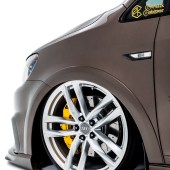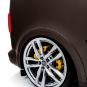 An ABP air ride system is fitted that utilises Bilstein front struts and their in-house bags. The rear features a split-leaf system and, again, uses Bilstein shocks. This hardware is managed by a Grinds G1 system. Whilst the van looks purposefully low when aired out or cruising, retention of factory arch liners to protect the longevity of the daily driven van means that it does not lay frame like some builds we have seen as the decision for air on this Caddy was made as a compromise between looks and practicality. The execution of the system is in keeping with the high-end finish of the rest of the build and the tank, dual compressors, water traps and check valves are all installed under the rear of the van, on a custom mounting plate and enclosure. Genuine 20” Audi A6 wheels provide the OEM+ icing on the cake to the chassis modifications.
