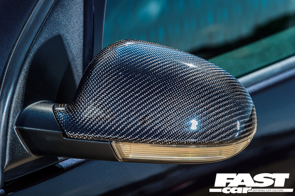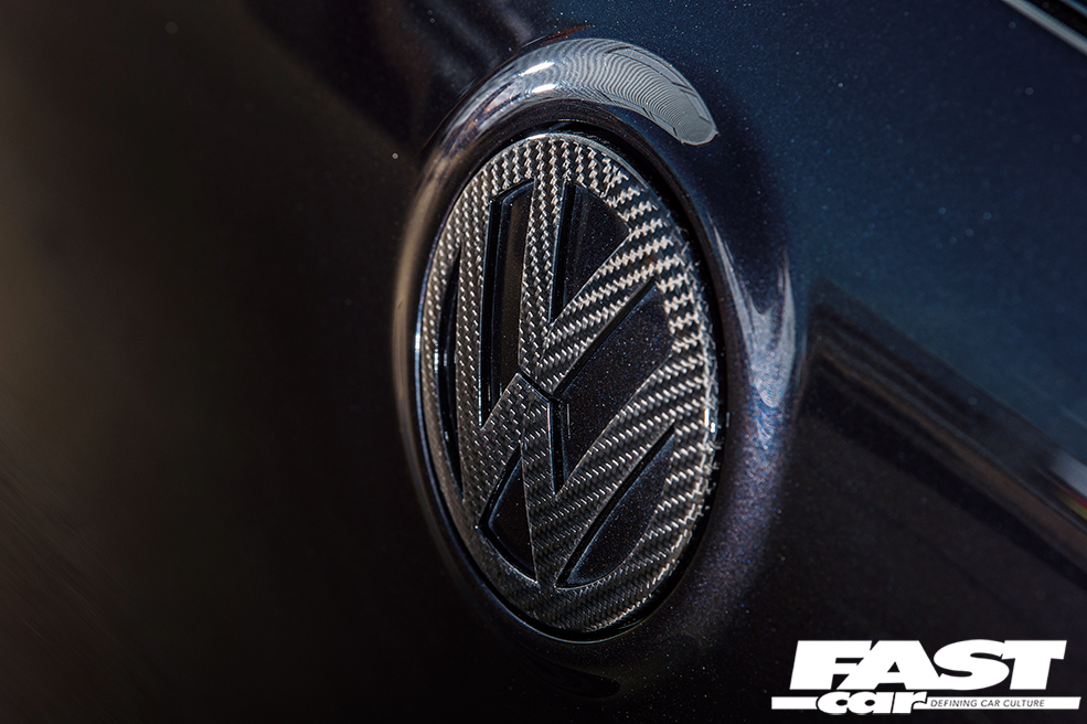 The secret to a clean car, according to Kev, is basically painting it every year. The guy is clearly obsessed with perfect paint. While he’s been reworking the body, a few mods have crept in along the way, too, including a smooth front bumper and R32 rear item, plus a de-badged grille, meaning the bonnet badge notch also had to be smoothed over. Kev has also added a few carbon touches (his own custom work), including carbon fibre mirrors and a carbon rear badge, plus he knocked up some carbon Pirelli Edition show plates as well.