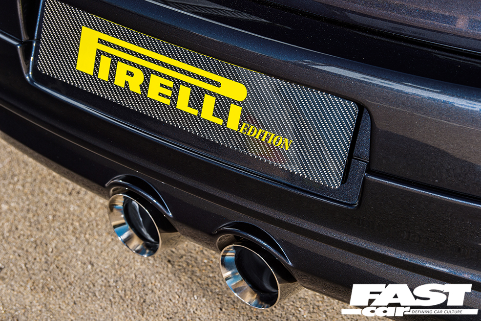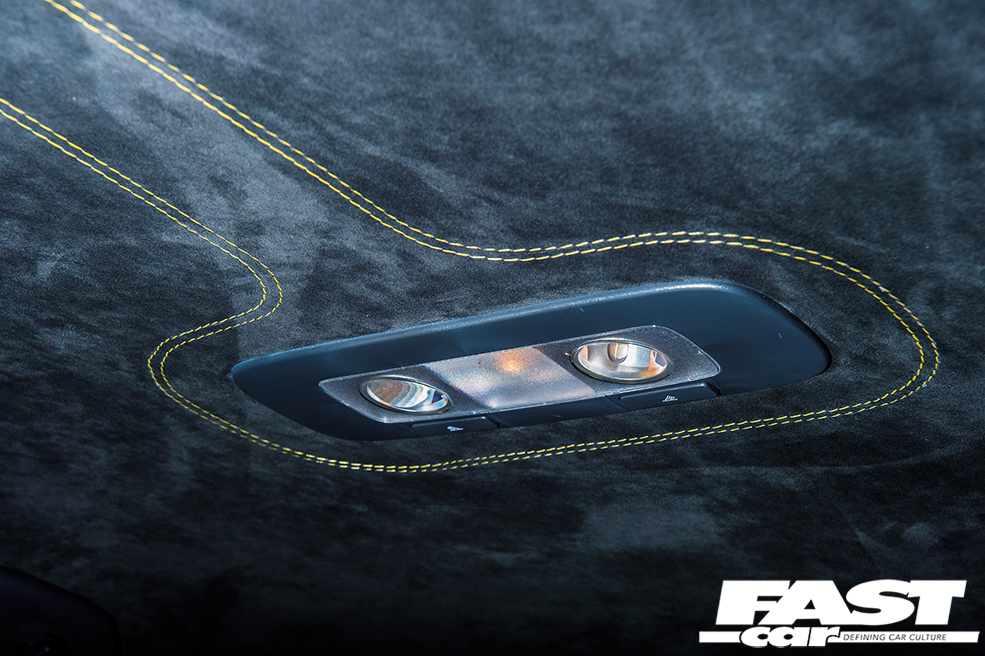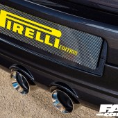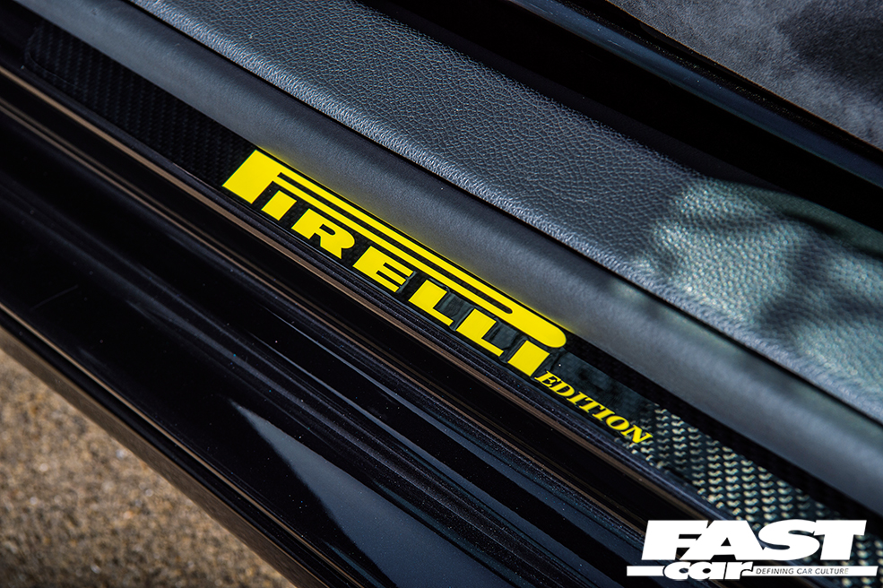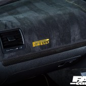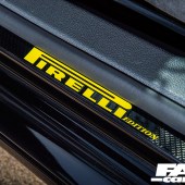 Dashboard, centre console, arm rest, seat bases, door card tops and roof lining (plus A, B and C pillars) trimmed in Alacantara with contrasting yellow stitching (with yellow Pirelli embroidered in dashboard) to match the Pirelli Edition seats, gear knob boot, steering wheel and parcel shelf trimmed in perforated Alcantara with yellow stitching, StillStatic black matts with yellow logo and yellow stitching, carbon fibre Pirelli Edition kick plates, dash inserts and seat pull details, yellow seat belts