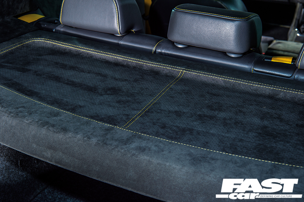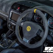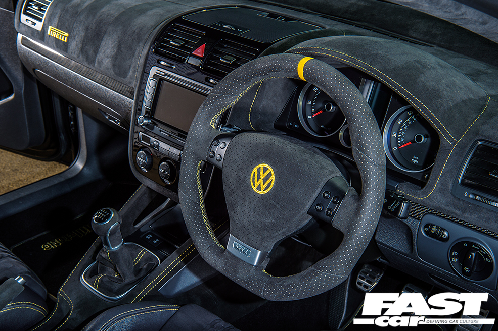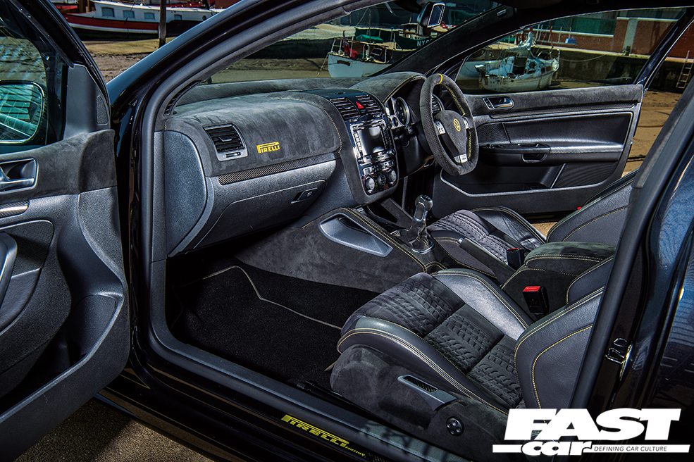 With the above mods alone, combined with the car’s unique factory interior, Kev’s Mk5 was a pretty sorted motor as it was. He wasn’t quite finished though and it’s actually the work Kev carried out to the interior that really completes the build in our mind: “I had Dan at Lavish Automotive work his magic on the interior,” said Kev. While Dan did a fantastic job of using the factory Pirelli seats as a theme for the rest of interior, we’ve got to give Kev props for having the vision in the first place. The grey Alacantara dashboard, with Pirelli logo embroidered in yellow, is pure genius. The Alacantara and yellow stitching continues along the centre console, the seat bases, roof lining (and all the pillars), plus the rear parcel shelf. Then there’s the perforated grey Alacantara steering wheel and gear knob gaiter, which breaks things up. The yellow seat belts were the icing on the cake to what is one of our favourite Mk5 builds ever!