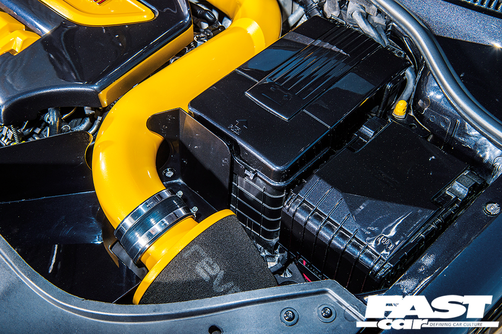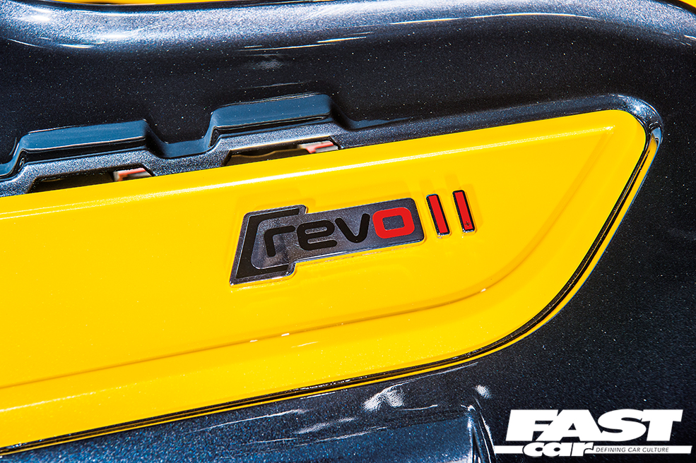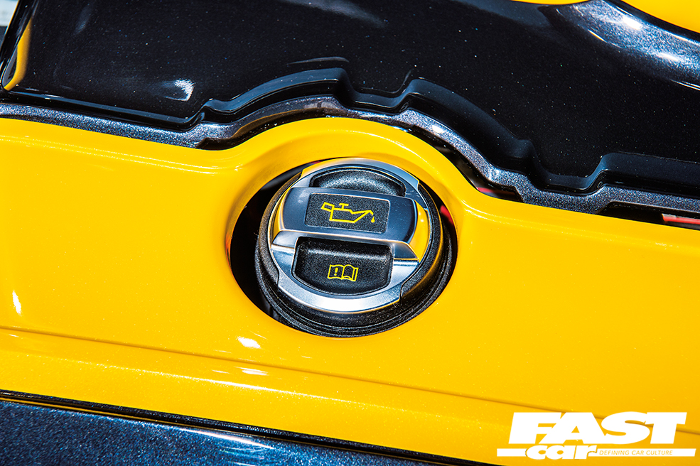Revo Stage 2+ map, LOBA Motorsport high-pressure fuel pump, Revo induction kit, Airtec Stage 2 front-mount intercooler, Helix clutch, BCS 3” turbo-back stainless exhaust with dual tailpipes, TT RS engine cover (painted yellow to match induction piping, bonnet/hatch struts and other details), R8 oil cap, plastic scuttle cover painted body colour along with battery cover