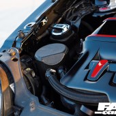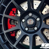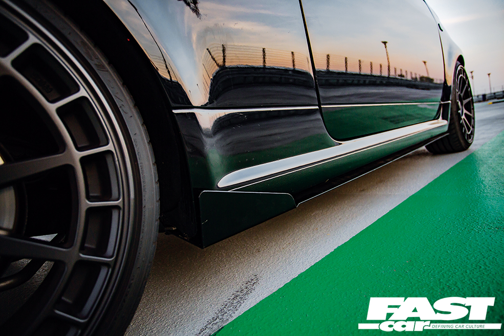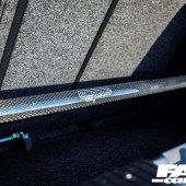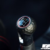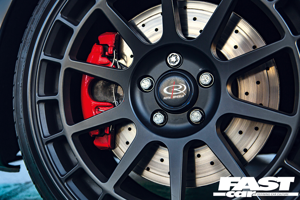 8×17” Rota Recce alloy wheels in matte black, 195/45/17 Hankook Ventus S1 Evo tyres, full five-stud hub conversion, KW V1 coilovers with Silver Project adjustable top mounts, Powerflex bushes (all-round), H&R front sway bar, Whiteline rear sway bar, Wiechers Sport carbon fibre strut braces (front and rear), Beetle RSI brake conversion with 312mm (front) and 256mm (rear) discs, Audi RS3 brake ducting