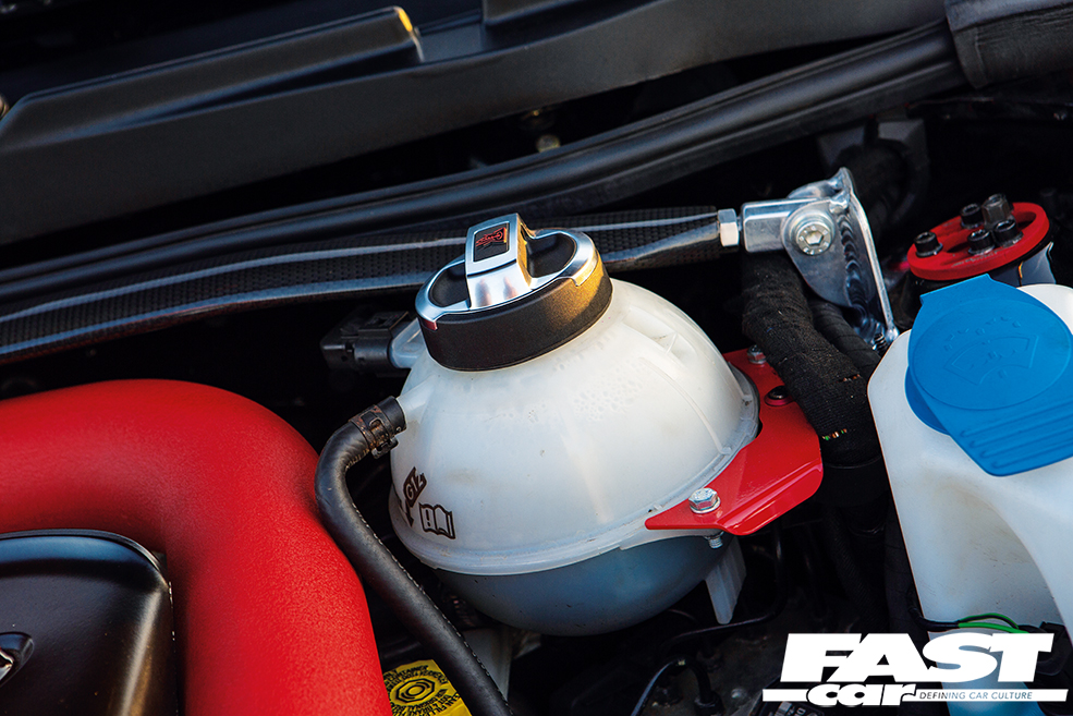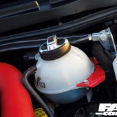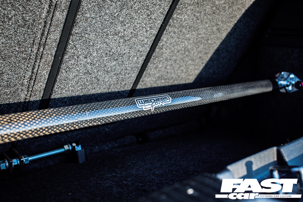 Talking of wheels, some matte black 17” Rota Recces now prop up each corner thanks to Ray’s five-stud hub conversion all-round. This also allows him to run the much beefier braking system from a Beetle RSI – a vital upgrade now the car has well over double the power it’s used to. The chassis is topped off with KW coilovers and some sumptuous Wiechers carbon fibre strut braces that give it the handling characteristics of something much larger and more grown-up as a result.